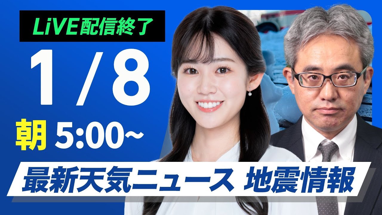 【ライブ】最新天気ニュース・地震情報2025年1月8日(水)5:00〜17:00/週後半にかけて日本海側で大雪警戒 西日本は平地でも積雪のおそれ〈ウェザーニュースLiVE〉