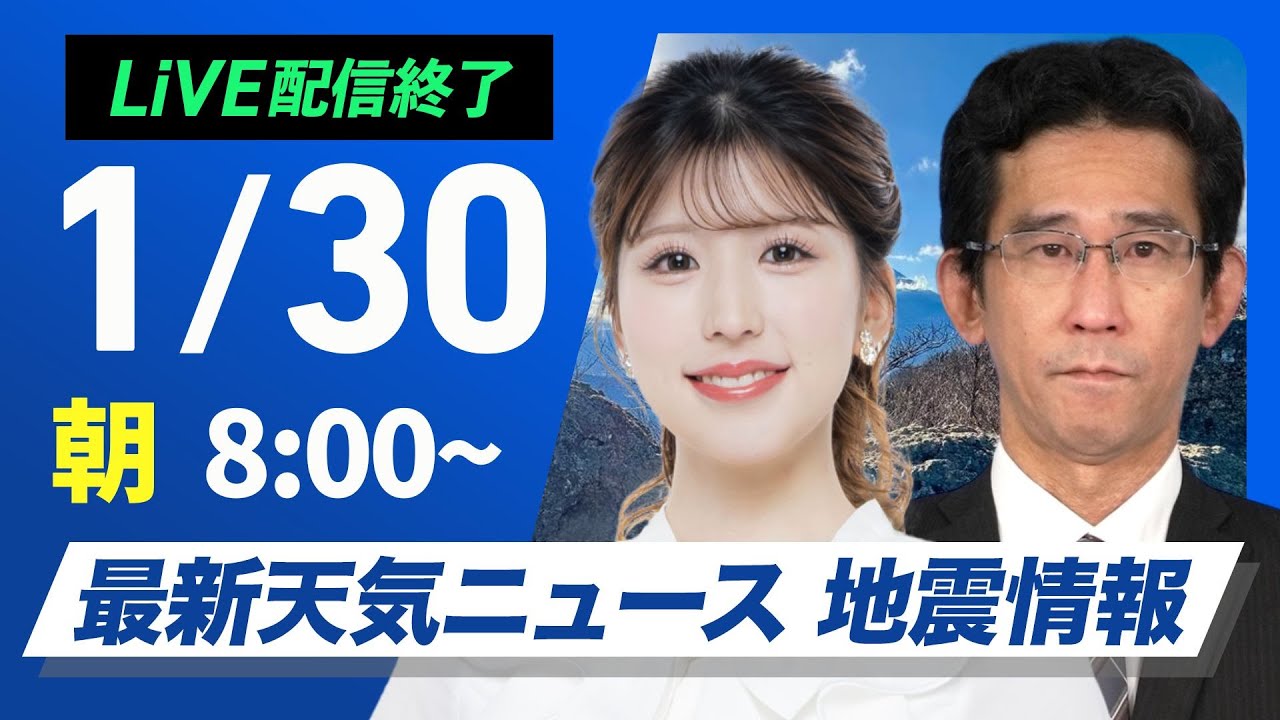 【ライブ配信終了】最新天気ニュース・地震情報2025年1月30日(木)/北陸や東北は大雪警戒 関東は晴れても風が冷たい〈ウェザーニュースLiVEサンシャイン・小林李衣奈/山口剛央〉