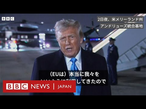 アメリカのドナルド・トランプ大統領は2日夜、欧州連合(EU)からの輸入品に対する関税発動を「近いうちに」開始すると発言した。フロリダ州の私邸からホワイトハウスへ戻るためメリーランド州の軍統合基地に到着した際、BBCなど記者団の質問に答えた。