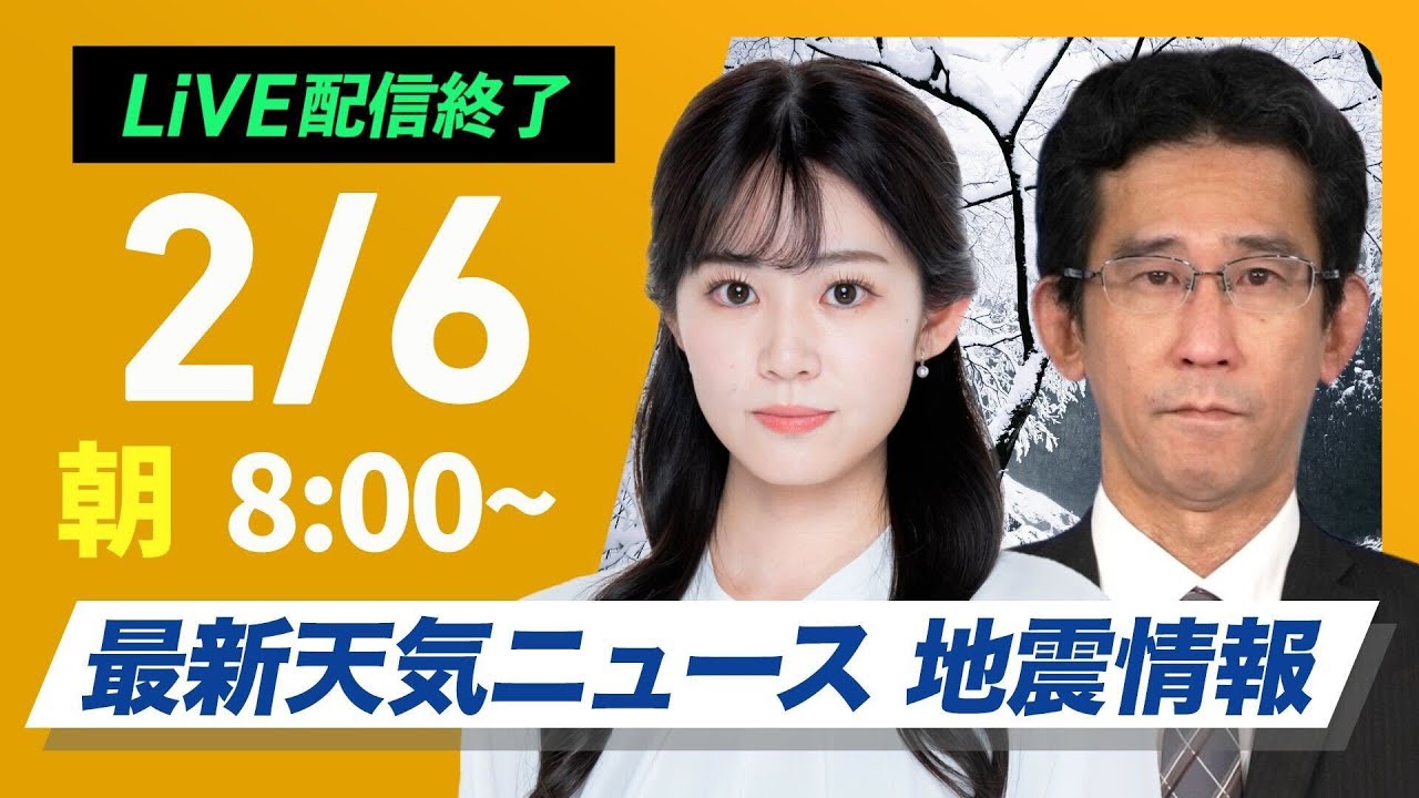 【ライブ配信終了】最新天気ニュース・地震情報2025年2月6日(木)/北日本の日本海側と北陸は大雪や吹雪〈ウェザーニュースLiVEサンシャイン・青原桃香/山口剛央〉