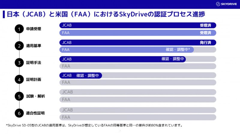 SkyDriveでは、同社の機体に特化した審査基準の詳細がおおむね合意に至ったことから、この審査基準に基づき、すでに航空局と議論を開始した試験の実施時期や内容について合意し、証明計画を策定。その計画に沿って、地上試験や飛行試験を実施していくとしている。