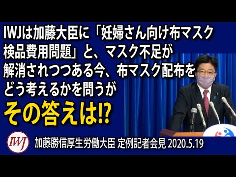 収録日 2020.5.19 IWJ Webサイトでの全編動画ご視聴はこちら→ ※IWJのこうした取材活動は、みなさまのご支援により直接支えられています。ぜひIWJ会員にご登録いただき、今後の安定的な取材をお支えください!→ ※また、カンパによるご支援もお願い致します! → #加藤勝信 #新型コロナウイルス #大臣会見 IWJIWJは加藤大臣に妊婦さん向け布マスク検品費用問題とマスク不足が解消されつつある今布マスク配布をどう考えるかを問うが519加藤勝信厚生労働大臣NewsPCR検査Videoインターネットメディアニュース加藤勝信厚労省厚生労働省報道大臣大臣会見定例会見岩上安身政治新型コロナウイルス禁アルコール製品時代来たる記者会見