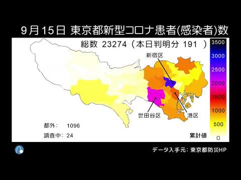 東京都の新型コロナ患者数(感染者数)マップの動画を毎晩更新中。報道される『感染者数』とは、実際には、陽性判定の人数『患者数』です。9/16時点で累計23,437人となります。このマップも患者数であり、本来の感染者数とは異なりますが、拡大傾向を把握できます。 データは、東京都防災ホームページ『東京都新型コロナウイルス感染症対策本部報』の区市町村別患者数(都内発生分)から取得しました。 最新のマップはこちらでも見られます: COVID-19NewsVideoコロナマップ地図患者数感染者数新型コロナウイルス感染症東京東京都新型コロナウイルス患者数感染者数マップ