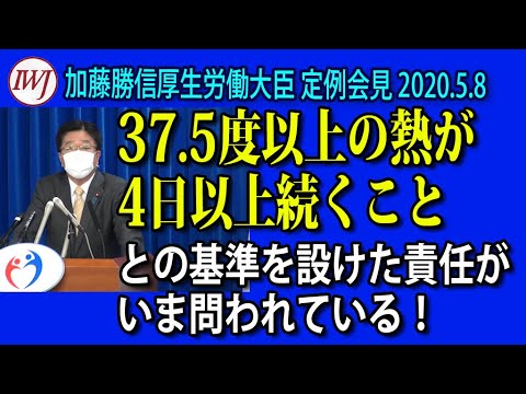 収録日 2020.5.8 IWJ Webサイトでの全編動画ご視聴はこちら→ ※IWJのこうした取材活動は、みなさまのご支援により直接支えられています。ぜひIWJ会員にご登録いただき、今後の安定的な取材をお支えください!→ ※また、カンパによるご支援もお願い致します! → #加藤勝信 #厚労省 #PCR検査 IWJNewsPCR検査Videoアビガンインターネットメディアニュース加藤勝信厚生労働省報道大臣会見定例会見岩上安身政治新型コロナウイルス新型コロナ治療薬の認可状況背景は厚労省が375度以上の熱が4日以上続くこととの基準を設けた責任がいま問われている厚労大臣に直接聞くが加藤勝信厚生労働大臣