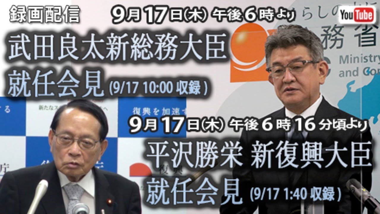 収録日 2020年9月17日(木) ※IWJのこうした取材活動は、みなさまのご支援により直接支えられています。ぜひIWJ会員にご登録いただき、今後の安定的な取材をお支えください!→ ※また、カンパによるご支援もお願い致します! → 18時録画配信武田良太NewsVideoフルオープン917就任会見平沢勝栄新復興大臣新総務大臣