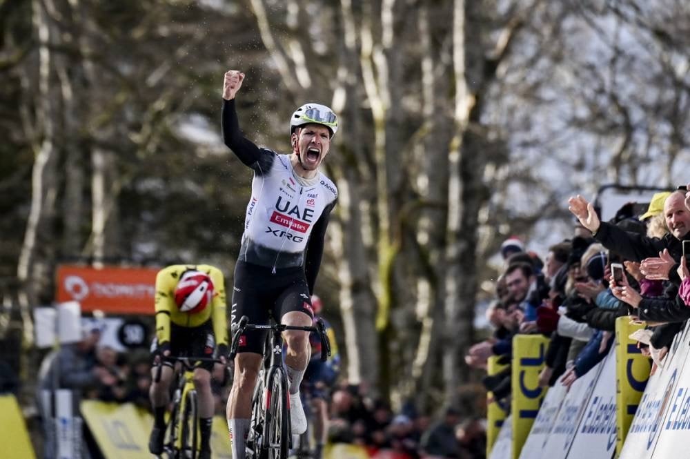 フォスを捉えたヴィンゲゴーは残り2km地点でマルティネスを引き離す。チームとビュグマとのスポンサー契約更新をアピールするべく、赤と白のスペシャルカラーのヘルメットを被るヴィンゲゴーはライバルたちに10秒差をつける。しかし残り1km地点を過ぎるとジョアン・アルメイダ(ポルトガル、UAEチームエミレーツXRG)が猛追を見せた。