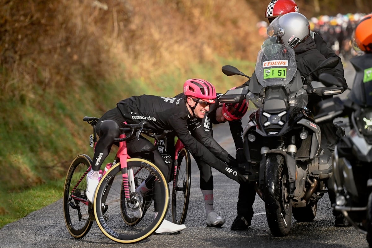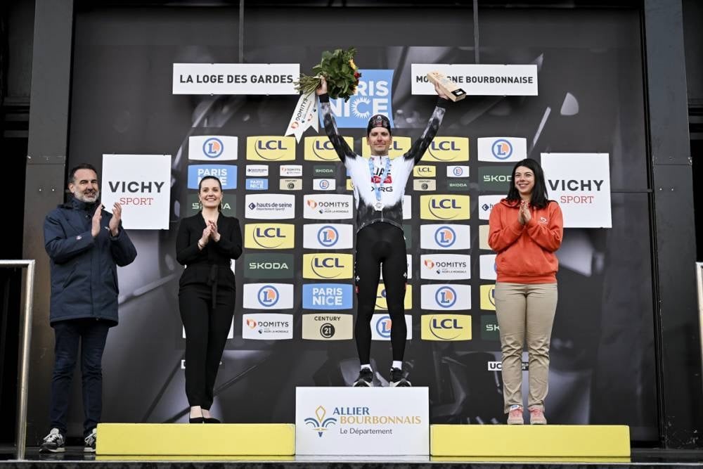 雹と雪でレースが一時中断されたパリ〜ニース第4ステージ。先行するヴィンゲゴーをジョアン・アルメイダ(ポルトガル、UAEチームエミレーツXRG)がフィニッシュ手前で抜き、勝利。総合首位にはヴィンゲゴーが立っている。