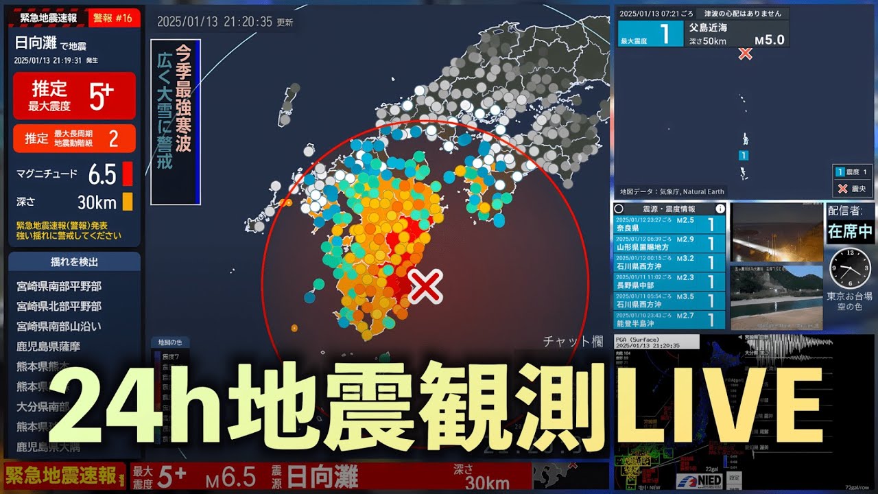 【強震モニタ】🔴24時間地震観測LIVE (地震・津波情報)[コメント読み上げ] 緊急地震速報、地震情報、津波情報、気象情報などがリアルタイムで分かる配信です。 画面には投稿時にコメントが流れます。 地震発生時、強震波形が上下に大きすぎて見えなくなるのを防ぐため、全体を見れるように小さめに設定しています。 観やすくするため、全体の色をできるだけ統一しています。 配信には若干の遅延がありますがご了承ください。 地震ライブ地震情報強震モニタ