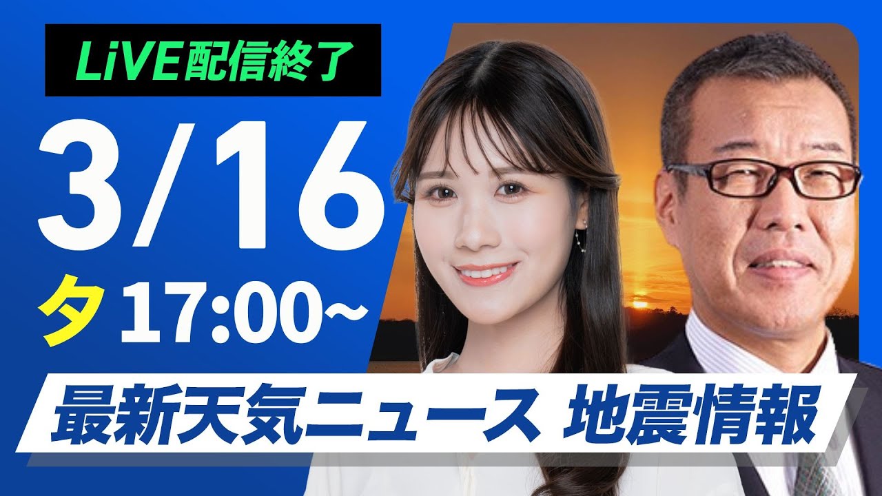 【ライブ配信終了】最新天気ニュース・地震情報2025年3月16日(日)/〈ウェザーニュースLiVEイブニング・戸北 美月 /森田 清輝〉