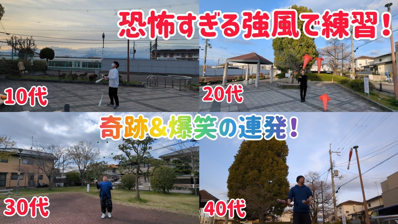 恐怖の強風の中で10代・20代・30代・40代のジャグリング練習!奇跡と爆笑の連発w