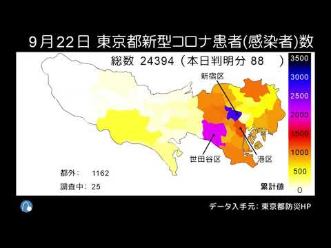 東京都の新型コロナ患者数(感染者数)マップの動画を毎晩更新中。報道される『感染者数』とは、実際には、陽性判定の人数『患者数』です。9/23時点で累計24,453人となります。このマップも患者数であり、本来の感染者数とは異なりますが、拡大傾向を把握できます。 データは、東京都防災ホームページ『東京都新型コロナウイルス感染症対策本部報』の区市町村別患者数(都内発生分)から取得しました。最新のマップはこちらでも見られます: COVID-19NewsVideoコロナマップ地図患者数感染者数東京東京コロナ感染者今日東京都新型コロナウイルス患者数感染者数マップ