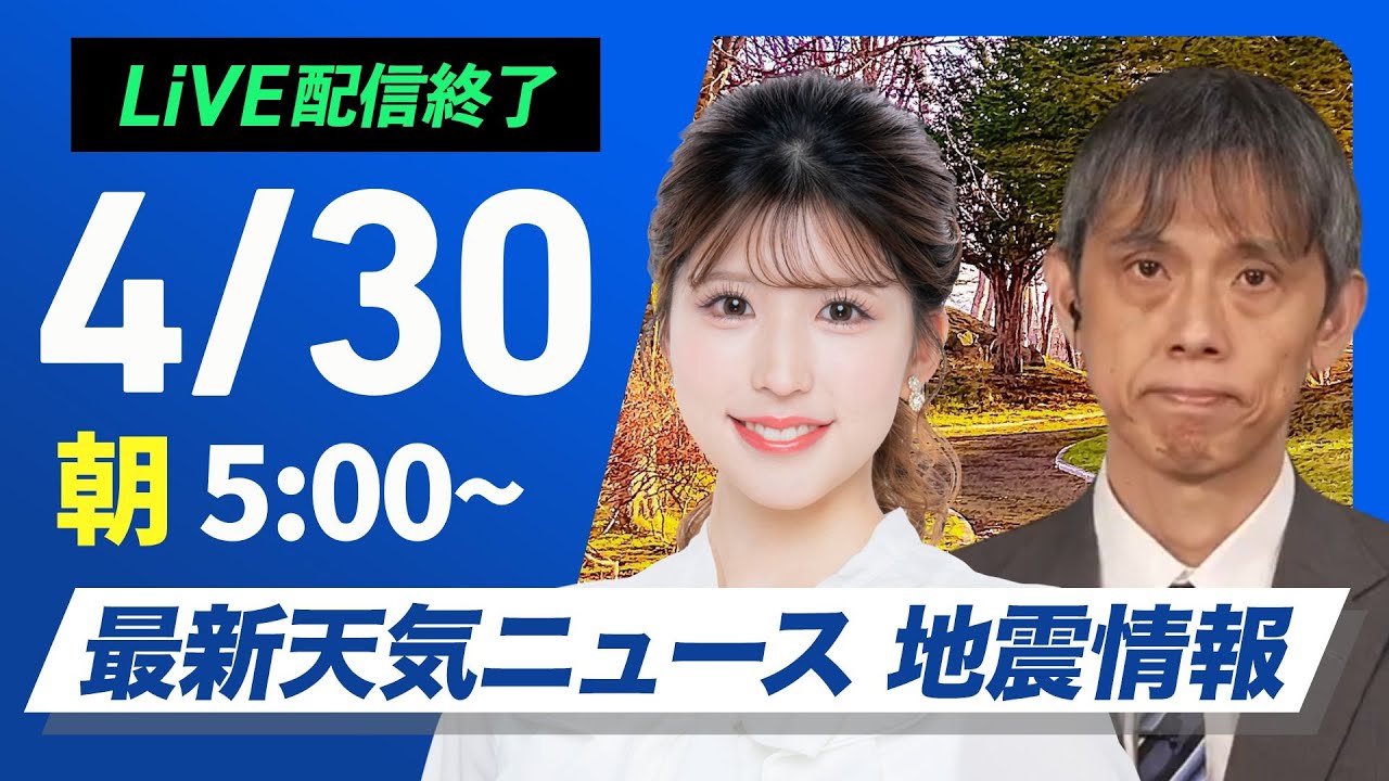 【ライブ配信終了】最新天気ニュース・地震情報 2025年4月30日(水)/西日本・東日本は晴天続く 北日本も天気回復〈ウェザーニュースLiVEモーニング・小林 李衣奈/芳野 達郎〉