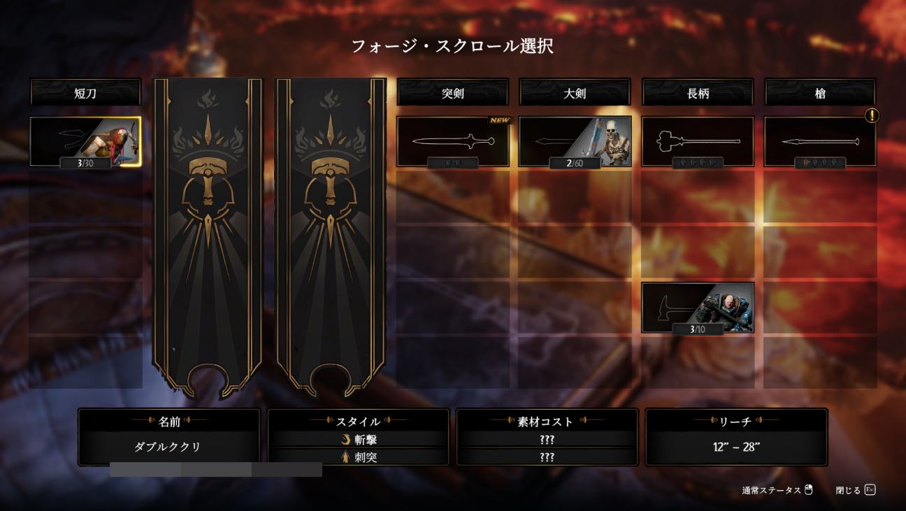 鍛造の第一歩は、大剣、槍、短剣などの大まかな7つのカテゴリーの中から、鍛造したいスクロール・フォージを選択することだ。たとえば「長柄」カテゴリーには主にハンマー系の武器が属しており、純粋な破壊力に優れる「ヒソップ」や、攻撃部位を切り替えることにより打撃と刺突の2つの属性を使い分けられる「ウォーハンマー」などのスクロール・フォージが存在する。なおフォージ・スクロールは、それぞれに対応する武器をもった敵を一定数倒すことで開放されていく。冒険を進めるごとに、作れる武器も増えていくという寸法だ。