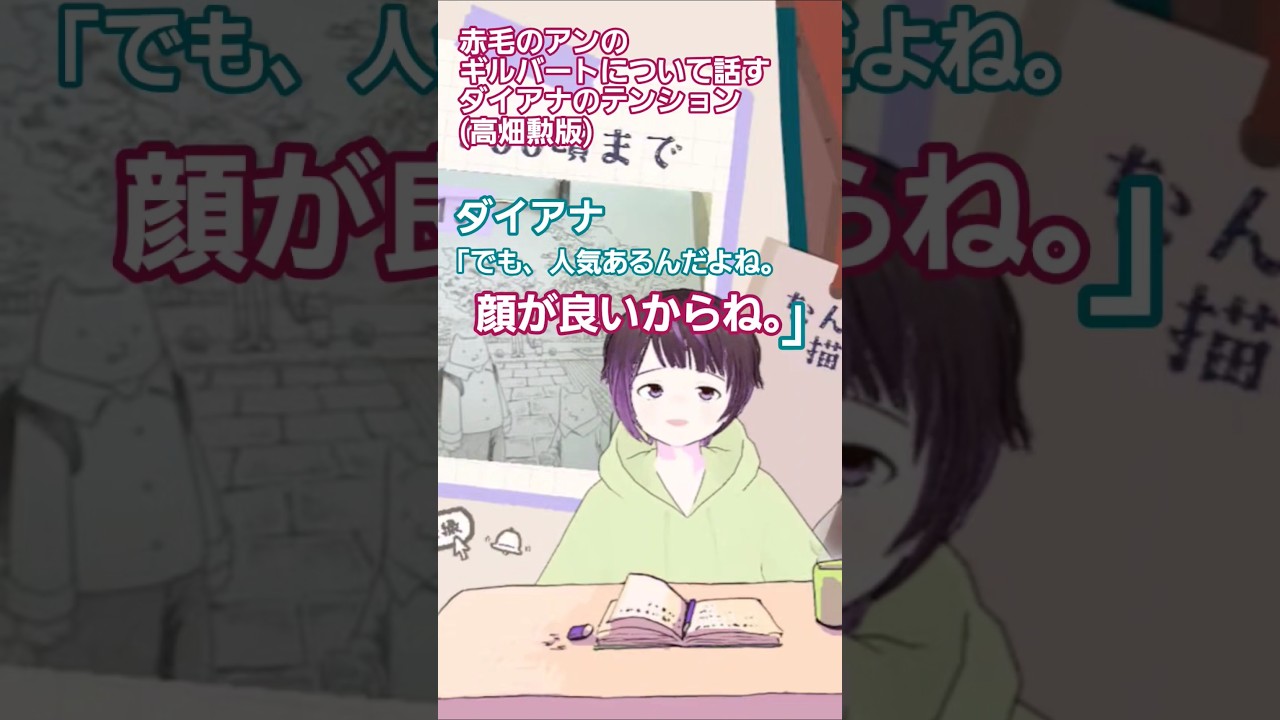 いろんな子に声かけてなんか自分は自分も なんか知らんけど髪が黒くてなんかカラス みたいだねとか言われてなんか意味わから んかった。なんかでも人気あるんだよ。顔 がいいからね。みたいななんかそんな感じ の紹介をするんだよ 。私の印象としては。ダイアナは ギルバートについてそういう感じの テンションで紹介をする 。私はそのダイアナが好き 。なんか人間っぽいんだよな 。高畑大穴は ちょっとクールな印象がある。