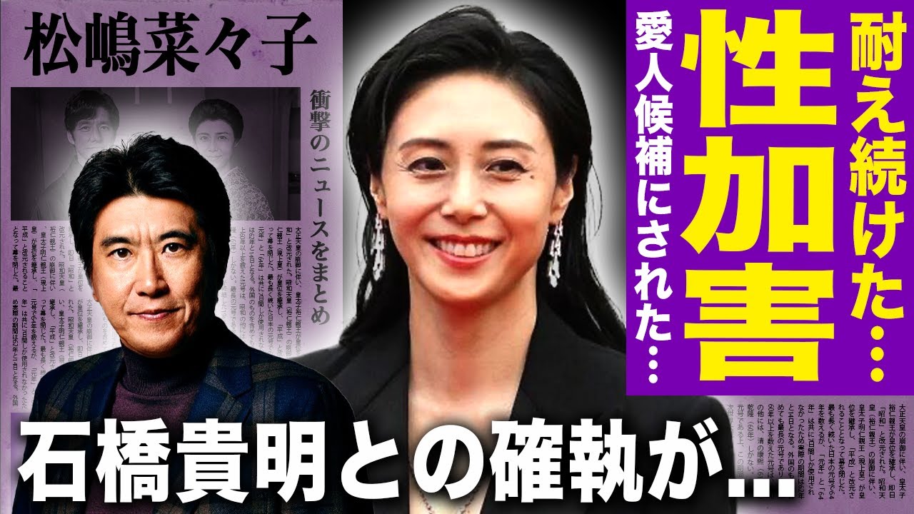 [音楽] 皆さん、こんにちは。50代になっても 女優としてやかな美しさと存在感で活躍し ている松島子さん。今回は松島七子さんに まつわるちょっと刺激的な話題をお届けし ていきたいと思います。公開セ原や石橋 高明さんにナパされていたという噂。朝ド 交板黒歴史元風俗ソープ情説離婚機器子供 についてスタッフから嫌われている劣化し たなどなどかなりセンセーショナルな噂が 飛び交っています。とはいえ松島七子さん といえば日本を代表する大女優であり50 歳を迎えてもなお輝き続ける女優の1人 です。ですが、その長い芸能生活の裏では 黒歴史と呼ばれる過去の出演コントや審議 が曖昧な噂が耐えず話題に上がることも しばしば。今回はネットや週慣誌などで 取り沙汰されてきた情報を整理しながら、 果たしてそれはどこまで事実なのか、なぜ そんな話が出ているのかを探ってみたいと 思います。まずは最近取り沙汰されている 石橋高明さんによる過去のセクハ疑惑から 松島七子さんの名前が再びクローズアップ されている件について見ていきましょう。 25年4月上旬トンネルズ石橋高明さんが フジテレビ関連の報道書類第3者委員会の 調査報告書で下半身露出をした可能性が あると報じられネット上で大きな騒ぎと なっています。10年以上前にフジテレビ の女性社員を飲み会に誘い、2人きりに なった際に下半身を露出したとされ、これ を巡ってはそもそも石橋高明は番組内でも よく女性にセクハしていた。昔松島七子に も抱きついたり卑猥な言葉を言わせていた など過去の言動を問題視する声が紛出し ました。特にネット上では石橋さんは 松島七子さんにひどいセクハをしていた。 食わず嫌いでゲスト女性の胸を触ったりし ていたといった書き込みが参さらに若い頃 綺麗だった松島7子を六本着でナパしたと 話していたエピソードも掘り起こされてい ます。こうした背景から今回の下半身露出 報道は驚かない。やっぱりトンネル ずらしい振る舞いという声も多く上がって いるのが現状です。ここで一気に クローズアップされているのが松島七子 さんがブレイク前1995年前後に出演し ていたトンネルズの皆さんのおかげですと いうバラエティ番組のコント企画近未来 警察072です。このコントでは当時まだ 駆け出しの女優だった松島七子さんが7 隊員という役所で石橋高明さんや木の竹 さんから蹴られたり下ネタを言わされたり と今の基準で考えると放送が難しいような 過激な内容が展開されていました。セリフ もかなり際どい表現が多くああ癖になり そう。今日は私が上になるわ。だめ中は ダめ。などいかにも性的なアクションを 連想させる駆け合いを強制される形だった ため、現在ではセクハの典型として語ら れることもしばしば。松島七子の黒歴史と してネットに度々取り上げられ、まさか あの成純な松島七子がこんなコントに出て いたとはと衝撃を受ける方も多いようです 。ただし当時のフジテレビはお笑い払い機 の自由度が非常に高くトンネルズの人気も 手伝いでした。視聴率を取るために多少 強引な企画も通りやすかったのかもしれ ません。もちろん今なら間違いなく批判さ れる内容ですが、当時の時代性の元で成立 していたという背景を踏まえる必要がある でしょう。続いては松島七子さんを語る上 でずっとさやかれ続けている元ホステ吉原 の高級ソープ場だったという噂。こちらは 完全に審議不明の半疇ですがネット検索 すると度々そのワードが浮上します。曰 17歳でデビューしたもののその後2年間 ぐらい表だった活動がなかった時期に銀座 や六本木のクラブでホステをしていた らしい。本泰さんの愛人だったというもの まで飛び交っており、どれもかたる根拠は 示されていません。さらに大人向け情報と して吉原の超高級ソープで働いていたと いう説も根強くさやかれていますが、これ も当時その店を利用した人の目撃証言や 在籍リストなど具体的な証拠は一切なし。 業界関係者の話としてすらはっきりした 裏取りはないようです。むしろデビューし てすぐは水着モデルやドラマのをこなして いたが、なかなか目が出ずアルバイト感覚 で接客業もしていたのではと勝手に想像さ れている面が大きいように見えます。こう した噂がなぜここまで広まるのか。その 理由の1つにはトンネルズとの過激コント をこなせるぐらいだからそっち方面の経験 があったのではといった偏見があるからと も言われています。しかしながら事務所や 松島七子さん本人が過去にソープだったと 認めた事実はなく、証拠も乏しい以上、現 時点ではネット上の都市伝説の息を出ない 話と見て良いでしょう。続いて最近の ドラマ関連で聞こえてくるのがNHK 朝ドラをすぐ交板した説。これは2025 年4月期の朝ド。アンパンに松島七子さん がメインキャストの1人として出演し ながらほんのわずか数話で退場したことが 交番と言われ視聴者がもう見収め早すぎる 体場は残酷すぎるとSNSでざつ