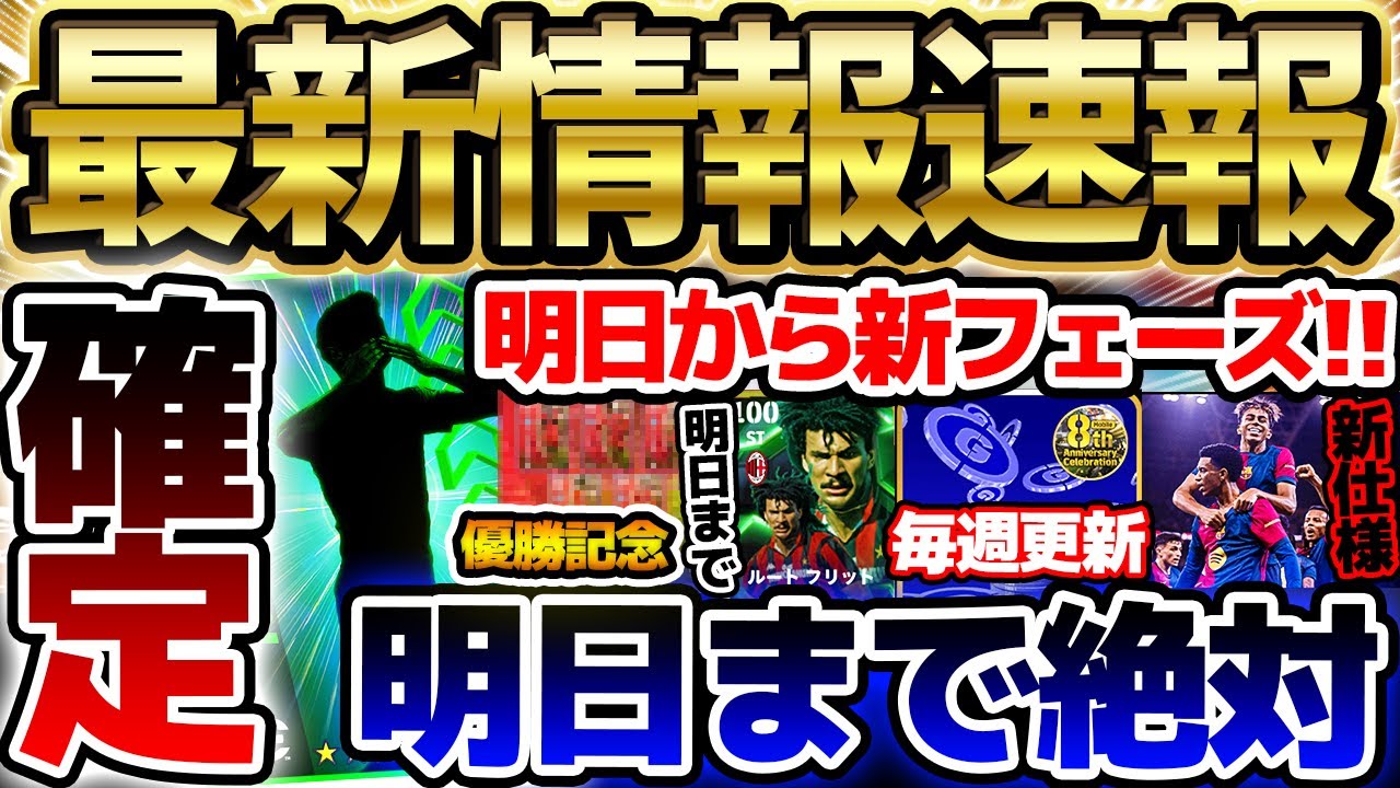 皆さんどうもこんにちは。です。 こんにちは。5月14日水曜日ニュース やっていきたいなと思います。このですね 、毎週水曜日の言っは1週間の中で1本の 動画にしきれなかった細かい情報だったり とか明日のアップデートに関する最新情報 をがっつりまとめていきたいなと思います 。本日の目次はこんな感じ。是非最後に見 ていただいてちょっとでもいいな参考に なったなって思ったら高評価チャンネル 登録是非よろしくお願いいたします。では 行きましょう。レッツゴー。で、そうだ。 いきなりですね、ちょっといい人とは関係 ない話になっちゃうんですけど9月の サッカー日本代表の新前試合の相手が 決まったみたいですね。9月7日か9月 10日にアメリカメキシコとの対戦が決定 。ワールドカップ開催で開催国とやれるの すごくいい経験になりそうですよね。僕も 予定ば完成配信する予定なので一緒に応援 しましょう。で、こっからはですね、 ウットボールの話していきたいなと思うん ですけど、まずはイフト公式大会EJ リーグの話題から。このですね、EJ リーグっていうのはJリーグの各クラブの 代表がEフットボールで戦う大会になるん ですけど、決勝大会当日はなんとゲストに 太田さん、安田さんが来て一緒に大会を 感染したりイフトができる機会もある みたいですね。是非気になる方は概要欄の 公式サイトから詳細をチェックしてみて ください。参加は無料みたいです。で、僕 がですね、個人的にいいなと思ったのが この取り組みでコなミさんが運営する銀座 のカフェでこの4つのJリーグのスタブル が期間限定で食べられるみたいなんですよ ね。いや、めちゃめちゃうまそう。ま、僕 だったらパジレモンサワー飲みながら両手 でお結びとレイソルカリー食べて食後に 紅茶いただきます。 ちなみにこのコラボメニを頼むと、J1、 J240クラブからランダムでリアル選手 カードってのがもらえるみたいですね。 いや、これもJリーグサポーターからし たらテンション上がるやつだと思います。 そしてですね、これ個人的に嬉しい ニュースでもあるんですけど、イフト公式 チャンネルでアンバサダー萩原リク君の 番組スタートしましたね。リク君は もちろんですけど、ゲストで来てる神お さんが想像以上でガチでビビりましたね。 気になった方はEF公式チャンネルから チェックしてみてください。てことで、 ここからはですね、ゲーム内の話をして いきたいなと思うんですけど、明日で コンフェーズが終了となりますので、実は 明日で終了するコンテンツめちゃめちゃ 多いんですよね。1つ1つ丁寧に話して いきますので、是非最後までついてって ください。で、その前に月曜日からの新 イベント、ま、特に新しいものはないです けど、セリアーがテーマでオンライン、 そしてオフラインともに更新が入っており ますので、1週間以内にクリアを目指して あげてください。 で、終了するですね。ガチャンペーンですけど、明日でフェーズが終わるということはマッチパス、 Eーフトリーグ、指名気役、この辺りが全て明日で更新となります。ま、マッチパスに関しては僕もコンウェイズね、まだ更新してないんですけど、ま、無課金の方はレギュラーだけで全然いいと思いますね。レギュラーであれば 50 試合全ての報酬回収することができますので、是非の 50 試合まではなんとか進めるようにしてみてください。 ちなみにこんな感じで後から解放しても 全ての報酬解放できますのでここはご安心 ください。一応解放しとこう。ちょっと あのこの獲得は面倒です。はい。先ほど 話した通りイーフトリーグも明日の11時 で終了になるんですけど実はすごく大事な ポイントがあってコンフェーズから最高 到達報酬ってのがなくなって報酬は全て このアチーブメントに集約されてるんです よね。このアーチュメントに関しては、 AI戦でも対人戦でもどちらでもいいので 、どちらかでディビジョン1まで行けば こんな感じで全ての報酬がもらえる形と なっております。僕実はAI戦の方ね、1 試合もやらなかったんですけど、太平戦の 方はね、1週間でしっかりとディビア行き ましたので報酬全て回収しております。で 、ちょっと注意点で言うといつもだと最高 到達に応じてもらえていたのでフェーズが 変わった木曜日のメンテに欧酬がもらえて たと思うんですけど、今回からですね、逆 にメンテだともらえなくて、メンテまでに この報酬を回収しておく必要がありますの で、ここだけは注意してあげてください。 とりあえず明日の11時までに1つでも 多くディビジョンを上げていただいて、 このイーフトリーグのアチーメントの報酬 の回収だけは忘れないようにしてあげて ください。この流れでアチュメントの話を していきたと思うんですけど、今来てる8 周年のキャンペーン。ま、ちょっとね、 ガチャこの後引くので、この1番上だけは 無視して欲しいんですけど、 アチーブメントのところは達成度8になっ て