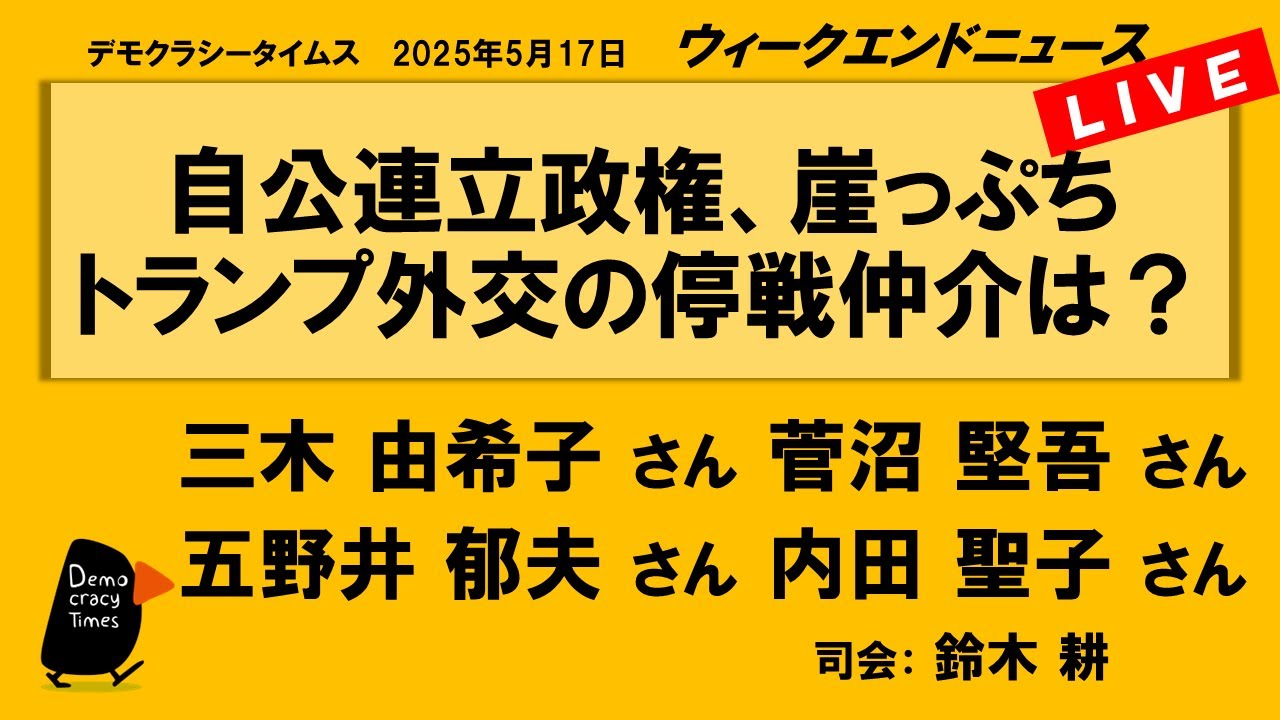自公連立政権、崖っぷち トランプ外交の停戦仲介は? (三木 由希子/菅沼 堅吾/内田 聖子/五野井 郁夫) ウィークエンドニュース 20250517