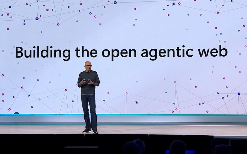 Nadella氏は冒頭で開発プラットフォームの変化について触れ、1991年には32ビットWindows、1996年にはWebスタック、2008年にはクラウドとモバイル、そして2025年に作る(build)のは『Open Agentic Web』だと語った。