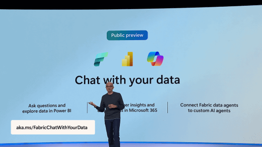 また、「PowerBI」や「Microsoft 365」のデータをチャット形式で調べる『Chat with your Data』をNadella氏は紹介した(Public Preview)。