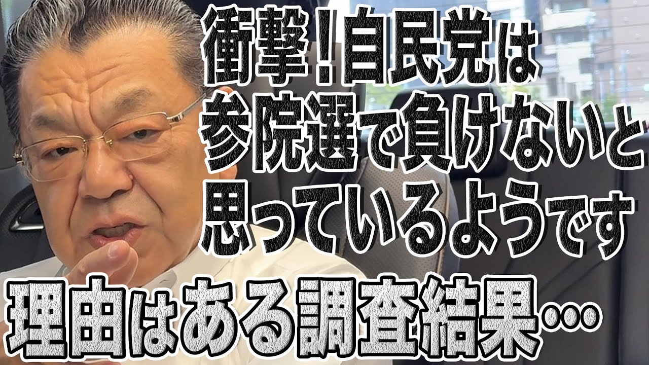 えっとですね、今日はちょっとね、自分 自身の疑問に自分自身の答えるみたいなね 、そういう話になってしまうのかもしれ ませんが、あの、先週来から起こっている ことについてどうしてなのかな、なぜなの かなと非常にですね、え、深く疑問に思い ましてですね、ま、一生懸命こう取材を 進めてきたわけなんですが、どういった ことに、え、疑問を持っていたのかという とですね、5月8日ですか、そもそもの きっかけが起こったのは、え、ま、森山浩 幹事長がですね、石首相とですね、解職を 持ちまして、そこで自民党のある種の方針 としましてね、え、7月の参議院選挙で、 え、ま、消費税は盛り込まないと、選挙 公約に盛り込まないと。で、自民党はです ね、え、ま、社会保障制度のですね、根を なしている消費事代については脳だとね、 いう方針をここで固めた自民党の2トップ が固めたわけなんですが、ま、そういった 、え、保証を固めたことを受けて森山ひ 幹事長はですね、まあ7月の参議院選挙の 争点が消費税減税を巡る税だというような 、え、総点設定をなぜか自ら進んで本来 だったらですね、ちょっとね、え、そこで 冷静立ってると思ったら違う総点設定を、 え、無理にでも合引委員でもしてくるのに まさにま、正面から受け止めるような形で 消費税、減税を総点設定にし、そして、え 、それについてですね、おれ、え、自民党 成長会長をですね、追随するような発言を しね、え、というようなですね、なんか 自民党執行部が、ま、おかしくなったよう にですね、あの、一斉に、え、消費税減税 については、ま、非常にですね、批判的な というか、絶対的に否定するような、え、 ま、発言を繰り返している。これで本当に 世論の指示は得られるのかどうなのか。 参議院選挙の賞賛が果たしてこの人たちは あるんだろうか。むしろ負けよう負けよう としてるんじゃないのか。なぜそんな、え 、発言を相変わらず繰り返して、え、世論 のですね、え、神経を魚でするかのような 、あるいは、え、野党のですね、え、ま、 ゴールをね、え、野党をしよう送るかの ようなそういった言動を、え、続けている んだろうか。が全然納得いかなくてですね 、どうしてそういった動きになってしまう のか。ま、そういった執行部の動きに対し てですね、自民党の内部からもですね、 不安する声、疑問する声、相ついで上がっ ております。こんなことで参議院選挙ね、 え、勝てると思ってるのかどころかなぜ 執行部は負けよう負けようとしているのか という疑問がですね、相ついで上がってる んですよ。私と同様の、え、疑問を持って いるんですよね。で、その謎がですね、謎 の一端というか色々話を聞いていくとです ね、あの自民党はこう考えて るっていうことが聞こえてきたんですよ。 それ一体どういうことなのかと言うと、 これ仮に消費税減税策を選択しなくても さほど自民党は負けない。さほど自民党は 負けないというですね、そういう誤解をし ているがあるんですよ。自民党執行部はね 。それはどういうことかっていうところを ちょっと聞いていただきたいんですが、 あの、ま、今回のね、え、参議院選挙と いうのは、ま、参議院というのはですね、 定数250です。関数を得るためには 125議跡が必要なわけですよね。全体で 250ですから。で、今回ですね、非改線 、え、参議院選挙との改めて言うまでも なく、え、6年ね、人気6年です。参議院 のね、え、とは言ってもですね、3年ごと に半分ずつの回線が行われるんですよ。 今回の7月の参議院選挙で非回改正組と いうのが自民党で62、公明で13ある わけですね。そうすると合計で75議跡な んです。75議跡しって、え、事項がです ね、え、関数ラインを維持するためには 50議跡必要。50議跡得られれば125 ということで、え、下半数にな るっていうことなんですね。50議跡が 必要。じゃあ今回回線はどのぐらいあるの か、回線組はどのぐらいあるのかというと 、え、ま、原職で自民党が52議跡、え、 公明党が14議跡、え、すなわち66議跡 なんですね。従ってですね、16議跡 減らすことができる。ま、それ16議跡 減らすことができるっていう言い方も おかしいんですが、16議跡減らしたとし ても関数は維持できると、だからバッファ は16議跡あるんだというような前提に 立つわけなんですね。この数字をですね、 是非ちょっと頭の形み入れておいて いただきたいんですが、そしてですね、実 は4月の26日から28日にかけて、だ からゴールデンウィークに入る直前ですよ ね。え、ゴールデンウィーク入る直前に ですね、え、自民党は情勢調査、え、これ 事務局長周りで行われている、自民党の ですね、事務局長周りで行われている かなりとされる、え、自民党の情勢調査が 行われました。自民党の情勢調査が行われ て、その結果が出てきたのを見るとですね 、あの、5議跡の47議跡ね、つまり、え 、自民党は52議跡あるわけですよね。 回線
