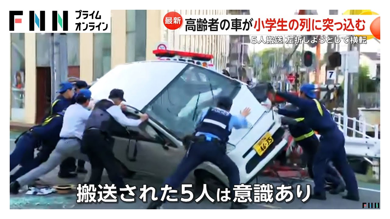 この事故で、車を運転していたとみられる74歳の女性と、下校中だったのか、9歳の男児を含む小学生4人の合わせて5人が病院に運ばれました。