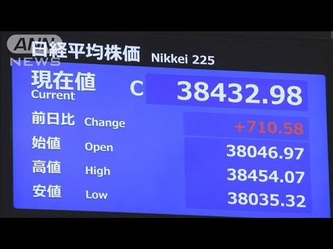 29日、寄り付きから節目の3万8000円台を回復し、一日を通じてほぼ一方的に上昇した日経平均株価。前日より710円高い3万8432円で取引を終え、およそ3カ月ぶりの高値水準となりました。