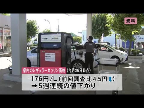 石油情報センターによりますと、5月26日時点の県内のレギュラーガソリンの平均小売価格は1リットル当たり176円ちょうどで、前回の調査に比べ4.5円安くなりました。5週連続の値下がりです。