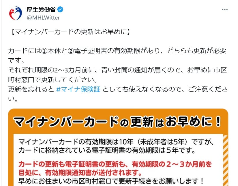 厚労省は「【マイナンバーカードの更新はお早めに】」とXに投稿。