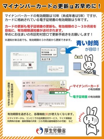 その上で「カードには(1)本体と(2)電子証明書の有効期限があり、どちらも更新が必要です」「それぞれ期限の2~3カ月前に、青い封筒の通知が届くので、お早めに市区町村窓口で更新してください」とコメントしています。