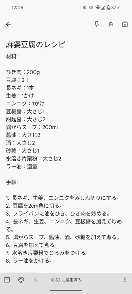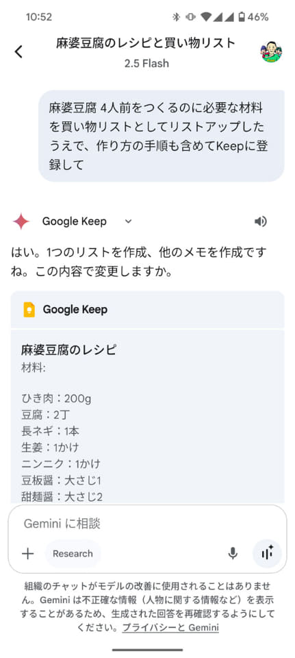 麻婆豆腐の買い物リストと作り方をKeepに登録するよう指示