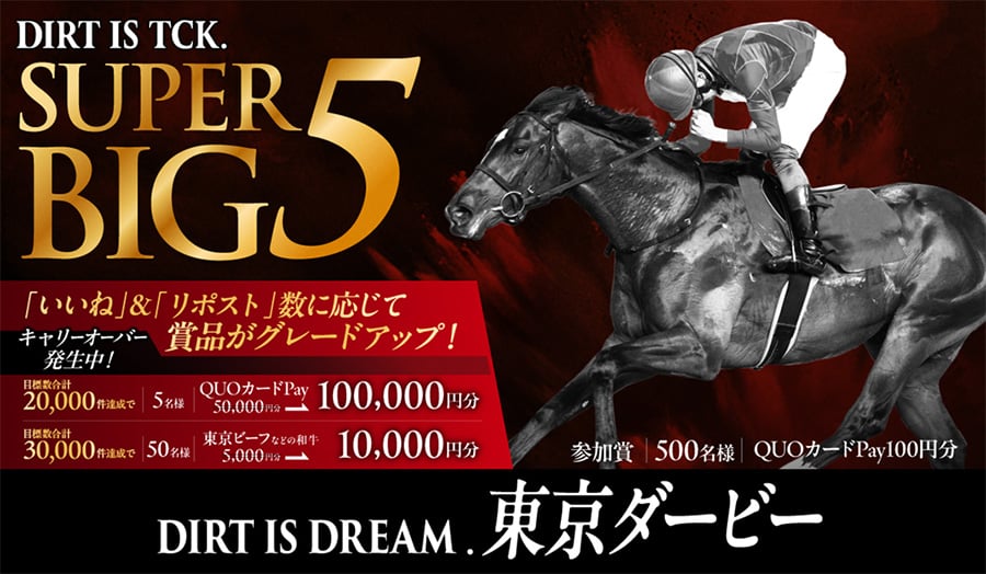 6月11日(水)東京ダービー(JpnI)を対象に、5大競走に関する「TCK SUPER BIG5 キャンペーン」を実施。TCK公式Xアカウント(@tck_keiba)をフォローのうえ、キャンペーンポストをリポストまたはいいねするだけで応募が完了。応募していただいた方の中から抽選で500名様にQUOカードPay100円分をプレゼントするほか、「リポスト」と「いいね」の合計値が目標数に到達すると参加者の中から抽選でQUOカードPay 100,000円分などの豪華賞品をプレゼントします。
