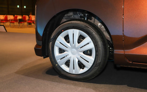 Xは14インチフルホイールキャップを装着。タイヤはダンロップ「エナセーブ EC300+」(155/65R14)