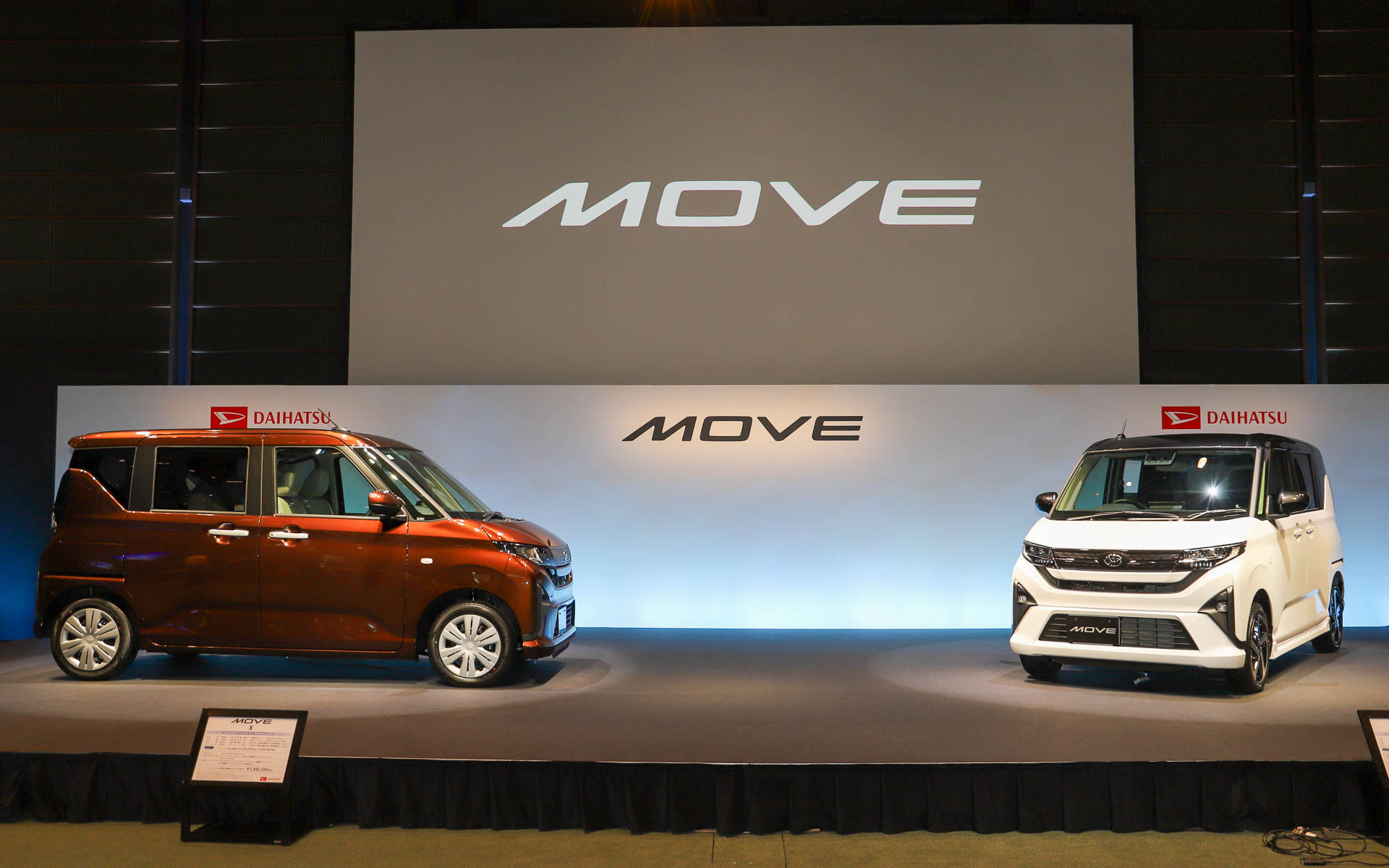 新型ムーヴと、ダイハツ工業株式会社 製品企画部 チーフエンジニア 戸倉宏征氏(左)、ダイハツ工業株式会社 代表取締役社長 井上雅宏氏(右)