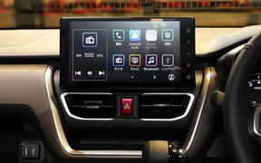 ノーブルシックスタイルのインテリアは、カッパー色の加飾を基調とした上質感ある印象に仕上げられている。メーカーオプションの9インチスマホ連携ディスプレイオーディオを装着