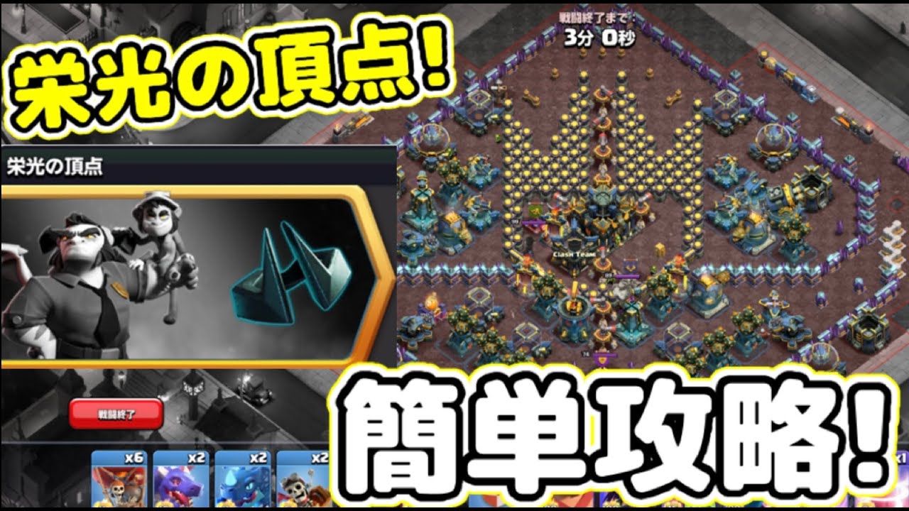 はいどうも皆さんこんにちは今回は6月の チャレンジ2つ目はい栄光の頂点の攻略法 を皆さんにお送りしていこうと思います ガラガラチャンネルのケスキ実局のケスケ ですポンということでね2つ目チャレンジ 英ですねこちら頑張ってはい簡単に攻略 できる方向ね頑張って本当に探してきまし たはいただねちょっとね初心者の方にはね ちょっと難しい点もあるかもしれませんの でちょっとねそこについてもねポイントの 方解説していこうと思いますまたねもう 難しいっていうコメントたくさん来まし たらまたねもっと簡単な攻略をね探して 動画に出しますんでそん時はえっと概要欄 もしくはコメント固定ではいコメント欄に ねあの新しいねこれの動画載せたねあの 出しておきますんでそちらの方から是非 ご覧くださいということで早速栄光の頂点 の攻略をお送りしていきましょうレッツ ゴー 課金される際は右下の歯車マークから詳細 設定クリエイターを教えでクリエイター コードKの入力をよろしくお願いいたし ますはいそしたらねまずはね初心者向け 解説の方やっていこうと思いますえっとね 今回にガゴプリの新装備ダーククランが はいついてるんですけどそんなね関係ない ですまたねあの別の動画でねダーククラン についてはね解説していこうと思いますえ 今回ねポイントとしてはクエイクですね8 発ありますんでこう2発ずつ落としていき ますで打つポイントとしてはまずはね えっとねこの4時5時方面のこの龍園法 はいお尻向けてる亀ちゃんみたいなねあの 防衛説ありますよねそこの6時そこの下 ですねはいそこにアースクの呪文を2発 打ってあげてでここの投石器とモノリスに ダメージが入るように打ってあげますで さらにですねクエク2発ねもう1発ね打つ のはねここですねはいここダーク エリクサータンクありますよねそこの6時 下方向のちょっと右はえっと右を意識して えっとクエク打ってあげますここですね はいここに打ってあげますそうすると こっちのギアタバーと投石器両方に ダメージ入れることができましたはいこれ がね今回ねクエク打つポイントですねあと はですねえっとババ金を今回ね9時から 入れてくんすけどえここテスラ出てきたら 2本目のテスラ出てきたらはい1本目おっ たら真ん中にクエク打ってあげて能力を 解放してあげるっていう感じになります はいこれでねはいあちょっと待ってこれ うまくいってないこれうまくいってないん すけどもう1回行きますよえっとバキを 出しますでえっとこっちの2本目のテスラ 出たらはいクエイクを打ってあげてからの はい1本目のテスラ打った壊したらはい クエイクをねはいあのスパイクボール発動 して投石以外の施設をね位してあげます あとは次ねこっちのねあの防衛スですね ここもここら辺あたりに打っといてあげて でウォーデンを空にしてあげてファイヤー ボール打ってあげるでからのはいリターン の呪文で即回収これが今回のねえポイント のはいポイントになりますそうあの初心者 の方向けに説明するんですけどボーデンは ねあのここあのグランドボーデン矢印の マークありますのでねここでリクモード空 モード切り替えられますんでえっと矢印を 上向き方向の空モードに切り替えてあげて くださいこれがね今回のポイント解説と なりますはいではまずはね攻略をね テロッパー解説やっていこうと思います まずはえっと5時と7時の長談逮捕に スーパーガーゴイルを2体出してあげます でその間にですねアースクエイクをですね えっとさっき打ったポイントですねに2発 はいでさらにダエリタンクのちょいえ下の ねちょい右側に2発打ってあげますでそし たらねライドラをこっちの金庫に1体で こっちの金庫にも1体出してあげますで 壊してる間にですねバキを出してってあげ てで壁開けて2本目のテスラが出てきたら はいで1本目壊したらクエイクのブーツと スパイクボール能力発動してってモノリス とかを壊してあげますでそしたらですね 12方向えっとバルーンですねこれ出して あげますでえっとテスラがね出てくるん ですよテスラが出てきたあち食いを出して 即能力発動でジャイアントアローはい まっすぐ飛ばしますこれまっすぐ飛ば なかった時のね対処法もね後でお送りして いきますでさあえっとインビジョン呪文が 切れたらはいここにねスパガ号2体出して いただきますあ待って出す位置ミスったな ちょっとどう壊してオッケーギリ壊したで えギリ壊してくれたんでそしたらクエク2 発をこっちのね3軸角に落としてあげてえ ファイヤーボール即能力発動してってから の回収ですねしていってあげますで回収 終えたらえっとアイスハウンド回収したえ ウォーデンとか出してでガゴプリ援軍 ドラゴンライダー2体ドラゴン2体で残り バルーンをねはい全部出してってあげます でそしたらねここのえっとモノリス前に レジをねかけてってあげつつターンホール にはオーバーグローの呪文を打ってって あげますでえ次です