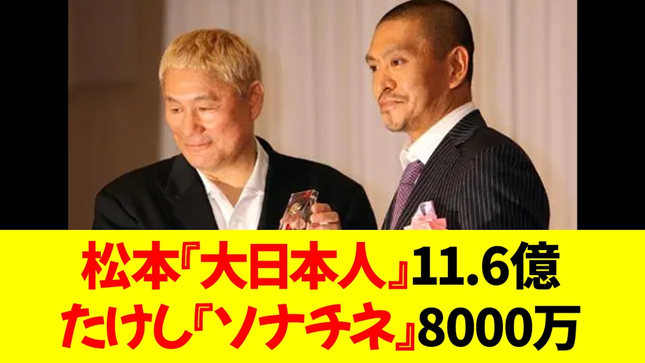[音楽] 比較工業収入松本第日本人 11.6億たけしそち8000万 たけ信者って何を持って映画監督として松本ひ上だと思ってるの 映画は後だとか芸術だとか言ってる意識高い系の人が評価してるのがたけしってこと なおその後収入でもたけしだろう 第1位砂糖一28.5億円第2位流ソと7 人の古たち16億円第3 位アウトレイジ最終勝 15.9億円第4位アウトレイジビヨンド 14.5億円かさん なんでそんな死ねえな1番売れたのと1 番売れてないの比べてんのか工業収入で見るなら松本は品川と西野ってことになるだろう [音楽] 西野はアニメだし品川は原作の人気のおかげでしょう 原作書いたのも脚本も全部品川なんだから余計にすごいだろ まつんの作品は何回だからねご視聴ありがとうございました芸能人有名人を中心に毎日投稿していますチャンネル登録高評価よろしくお願いいたします はい