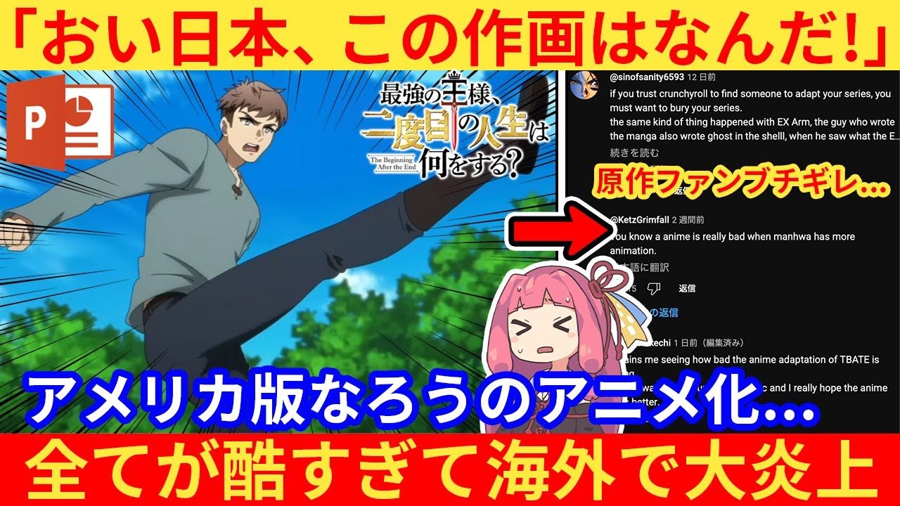 お姉ちゃんアメリカ版なローのアニメ家が なぜか海外で大演事をしているんだ一体何 があったんやってことで今回のニュースは こちら 2025年ワーストアニメが決定どうして こうなった最強の王様2度目の人生は何を するの秘評動画が欧米で話題になってい ました今作は北米版の小説が原作で4月 からアニメが放送開始された作品なんだ それが海外でキャンをしてるってわけか そう海外配信者さん曰く今年1最悪の アニメだと大激怒していたのX上でも 1000件以上のコメントがつくほど荒れ ていたんだ大バりしてるやんそんな騒が れるなんて一体何がひどかったんや たくさん批判される要素があるんだけど その中でも大きな理由を3つ紹介するね まず1つ目の理由は独自性のなさ大人気 作品の無職転生と激任な部分が多すぎると 指摘されているんだ草いきなり危ない橋 渡ってるやんなろうはお決まりのパターン があるけどどれくらい似てるんお父さんが お調子物の現術好きで子供に剣を 教え込もうとするところお母さんは美人で 癒し系おまけに回復魔法が使える設定とか ね確かにそっくりやでとはいえこれくらい ならまたセーフやろもちろんまだあるよ は床に寝転んで本を読むシーン読書し ながらお尻を書くという演出まで一致し てるのそんな場面を真似する必要なかった やんこれならネットがざくのも分かる気が するでこれらの類事点からまるで無職転生 のリメイクと消されていたよ作品の オリジナリティが少ないことが手厳しい 評価につがったみたいだね物語はまだしも 構図に関してはアニメスタジオがどうにか できたはずやでそして2つ目の理由は アニメーションの品質今作の作が特に戦闘 シーンが動かないと批判殺しているの まるでパワーポイントのスライドショだと やゆされていたねそそこまで例えば剣を 振り上げるポーズだけ移して次の瞬間には 敵が倒れてるみたいな演出が多いの確かに 政治ガの連続感があるなしかも弓矢を放つ シーンですら矢が飛んでるところをアニメ で見せてくれないんだ途中の攻撃シーンが 閉されてるから盛り上がりにかけるんだよ ねこれは手抜きと言われてもおかしないな あとは背景や人物にも違和感が多々あった のゲームのNPCのように棒立ちの人間風 1つ吹かない風景要は生命感が全く感じ られないんだ草違和感ならすぎるやろもう 作品の全部がダメってことやん中でも ひどかったのがキャラの口すら合ってない ことどんな底予さんアニメでもセリフと口 の動きくらいは合わせているのが普通なの にも関わらず今作ではそれすらずれて しまっているのおいおいマジかよもう そろそろお腹いっぱいになってきたで最後 の3つ目の理由はスタジオ選びの失敗映像 クオリティが低い原因は制作スタジオ選び が悪かったせいだと語られていたのここ まで見てきた流れだとまあそうやろなと しか今作を制作したスタジオAキャットは 過去作品の評価がめちゃくちゃ低いの クランチロールという大手配信サイトで 10点満点のうち5点台がたくさんあるん だ中には4天台の評価を受けている とんでもないアニメもあるねお世辞にも 人気のスタジオとは言えんなところで海外 原作者さんはこのアニメの仕上がりをどう 思ってるんやろ実は海外の掲示板で がっかりしていることを匂わせているんだ ただネガティブな発言はしていなかったよ おそらく契約所アニメ家についての直接的 な発言は禁止されていると考察されていた ねいわゆる主義務や信用基村の禁止って しがらみがあるのかも大失敗の理由を まとめるとストーリーアニメーション スタジオ選びという複数の要素で打作に なってしまったんだ特にこの中でも スタジオ選濯の失敗は大きく影響した みたいだね ここまで全要素にため出しが来るのも逆に珍しいよな原作ファンの怒りはまだまだ収まりそうにないでさてここからは今年最悪のアニメに寄せられた海外の反応を紹介していくよその前にいいねボタンポチっと押しといてな海外の反応 [音楽] このアニメは本当に悪役に満ちたキャラ崩壊だったよ ネタなのかと思うほどひどいアニメだった未完成すぎる マジで小説ファンとしてはこのアニメ化は 地獄のようだったよアニメ家のせいで こんなに叩かれて2シーズンだ絶望的なの が本当に残念この後はめちゃくちゃ面白く なる展開が来るのにまさか漫画の方が アニメより動いてる日が来るとは思わ なかった制作会社は潰れるべきこのアニメ か逆に原作を宣伝してくれたと思うことに してるあまりにもひどすぎて見られない からね アニメーションが低品質でも原作がいい作品なら大無しにはならないしかしこれはまともな物語をほとんど動かさずにぶち壊したやれやれって感じだよ 単にアニメーションの問題だけじゃないキャラデザもみだよ原作や小説の公式イラストがちゃんとあるのにどうしてああなるんだ 最初は無職転生よりエロくないし入り やすいかもと思ったけどアニメーションを 見たらやっぱルーデスで我慢す