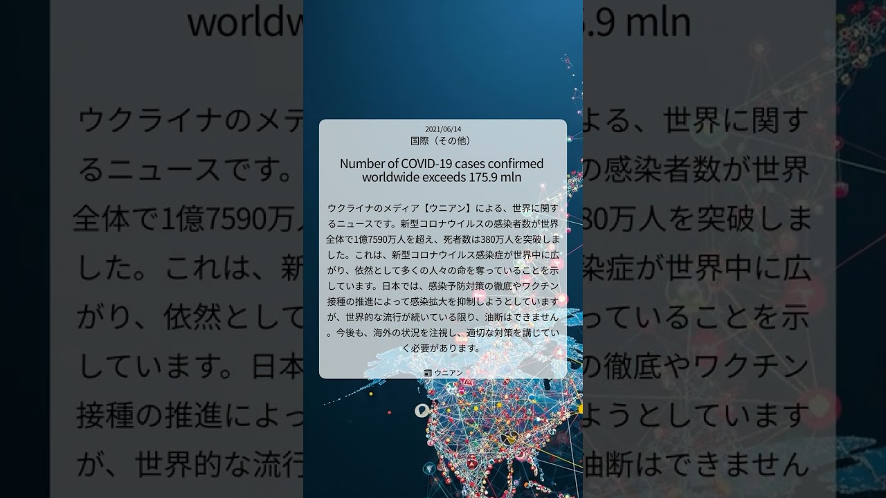 ウクライナのメディアウニアンによる世界 に関するニュースです新型コロナウイルス の感染者数が世界全体で1億7590万 人を超え死者数は380万人を突破しまし たこれは新型コロナウイルス感染症が 世界中に広がり依前として多くの人々の命 を奪っていることを示しています日本では 感染予防対策の徹底やワクチン摂取の推進 によって感染拡大を抑制しようとしてい ますが世界的な流行が続いている限り油断 はできません今後も海外の状況を中止し 適切な対策を講じていく必要があります