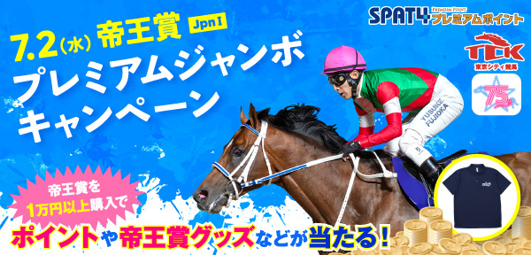 SPAT4プレミアムポイントでは、7月2日(水)帝王賞(JpnⅠ)をご購入いただくと、購入額に応じてSPAT4プレミアムポイント2,000万ポイントやカタログギフトなどを抽選でプレゼントする「TCKプレミアムジャンボキャンペーン」を実施します。その他にも、帝王賞ポロシャツなど豪華賞品をご用意していますので、帝王賞はSPAT4でお得にお楽しみください。