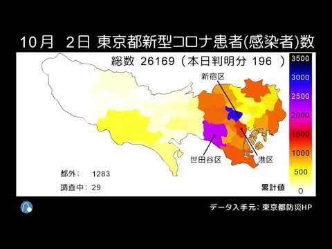 東京都の新型コロナ患者数(感染者数)マップの動画を毎晩更新中。報道される『感染者数』とは、実際には、陽性判定の人数『患者数』です。10/3時点で累計26,376人となります。このマップも患者数であり、本来の感染者数とは異なりますが、拡大傾向を把握できます。 データは、東京都防災ホームページ『東京都新型コロナウイルス感染症対策本部報』の区市町村別患者数(都内発生分)から取得しました。 最新のマップはこちらでも見られます: COVID-19NewsVideoコロナマップ地図患者数感染者数新型コロナウイルスで東京東京都新型コロナウイルス患者数感染者数マップ