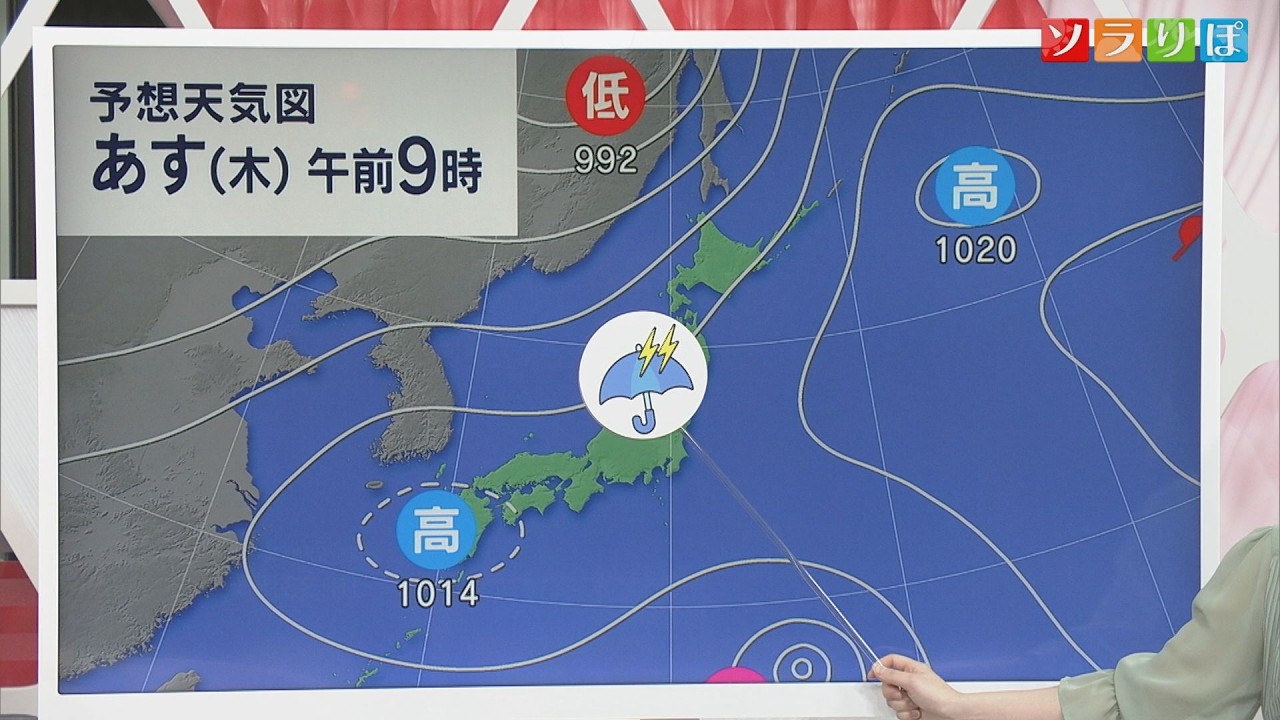 気圧配置がほとんど変わらず、県内付近は高気圧と高気圧の間の気圧の谷となって暖かく湿った空気が流れこむでしょう。このため、大気の不安定な状態が続き、局地的に激しい雨や雷となりそうです。
