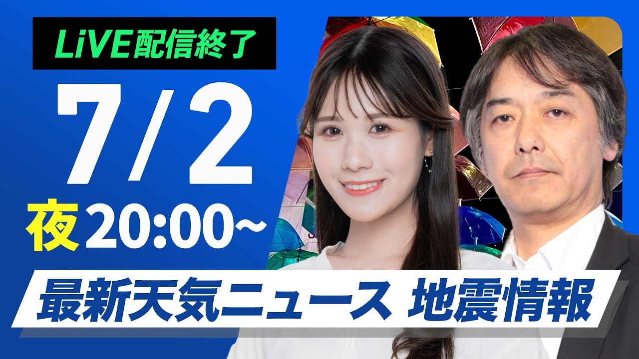 【ライブ配信終了】最新天気ニュース・地震情報 2025年7月2日(水)/記録的短時間大雨情報が相次ぎ発表 今夜まで局地的に雷雨のおそれ〈ウェザーニュースLiVEムーン・戸北 美月/宇野沢 達也〉