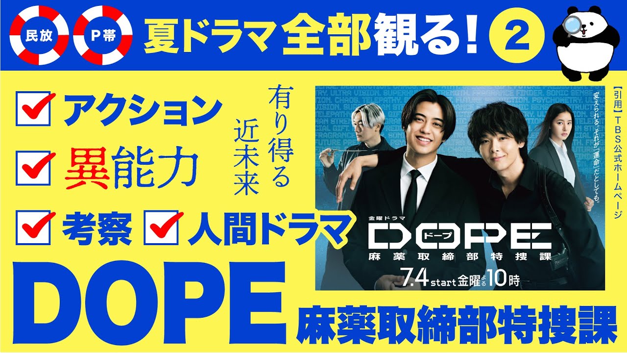 こんにちは。パンダママです。今年の夏 ドラマは法作のようですね。私は民法の プライムタイムのドラマを全部見てみよう と思っています。夜9時台、10時代の ドラマ。全部で16本。この夏はドラマを 楽しむ夏にしたいです。始まる順番に ドラマを紹介していきますが、今回紹介 するのはドプ真薬取締まり部特化家。7月 4日金曜日夜10時からTBSでスタート 。キング&プリンスの高橋カトさんと中村 智さんのダブル主演。ローパーと呼ばれる 異能力者に立ち向かう新感覚のマトリ アクションエンターテイメントということ でド派手なアクションとCGが両方 楽しめるだけでなく異能力特殊能力の話が 今までよくあった生まれつきの能力者って いう特別な人の話ではなく本当に近未来に 誰の身に起きてもおかしくない感じの妙に リアルな話になっていてとても興味深い です。近未来の日本特殊能力を覚醒させる 新型ドラッグドープが蔓延しています。 ドープを復用すると死に至る可能性が高い んだけど稀れに特殊な力を覚醒させること があるから手を出すものが後を立たない。 この辺りの設定がフィクションであり ながらなんかすごくリアルなんですよね。 近未来の日本で人々が希望を持つことが できず自望時期になっていたら死をかけて でも特殊能力を手に入れたい人がたくさん 出てきてもおかしくないですよね。 新型の薬物で特殊能力が覚醒っていうこと 自体も医学や科学が進めばなんだかあり そうです。行き過ぎた薬物によりカジ場の 馬カ力のようになって脳のリミッターが 外されてそれが特殊能力みたいになるとか ありうる気がします。ドプによって 巻き起こる不可快な事件の解決に挑むのが 麻薬取締まり部特装家です。その通称特走 化は高橋カトさんと中村智やさんだけで なく、荒木裕子さんたち他のメンバーも みんななぜかそれぞれに異能力を持ってい ます。高橋カトさんは未来余地、中村智屋 さんは調子力、他にも腕力、長力、嗅覚、 記憶力など 異能力がはてなはてなはてなになっている メンバーもいて、そこら辺は考察ポイント かもしれません。麻薬取締まり部特装家の メンバーはドープ副業者なのかと思ったん ですが、中村智屋さん演じる人内はドプを 強く憎んでいるらしく、なぜ異能力がある のか謎です。無理やり服用させられたのか 分かりませんが、過去に何か重大なことが あったようです。結構謎や秘密が多くて、 事件やら過去やら特殊能力やら色々と考察 が楽しめそうです。アクションであり、 異能力もであり、考察もでもある めちゃくちゃ濃厚なこのドラマ。出演者の 方たちのメッセージでもアクションを 楽しんでくださいとか、考察を楽しんで くださいとか、熱い人間ドラマを楽しんで くださいとか、それぞれ言うことが違うの も面白かったです。私が個人的な好みで 1番期待しているのは熱い人間ドラマです 。高橋カトさん演じる最気優はドープを 副用した犯罪者も構成させたいという正義 感に溢れま真っすぐな性格。中村智屋さん 演じる人内はドープ副者に霊国な一面が あり真逆。まずはこの主演の2人の それぞれの正義のぶつかり合いが見所です ね。 そしてその他の登場人物も抱える背景が それぞれに濃くて本当に人間ドラマとして とても面白そうです。最近の母親は夫と 私別し女で1つで息子と娘を育てていたが 、とあることがきっかけでドプ依存となり 、現在は厚生施設に入り治療を続けている 。子供たちを大切に思う母親である一方で とある思いから何度もドープに手を出して しまいということで最近は母親がドプ依存 という衝撃的な闇を背負っているようです 。さらに最気の妹は幼い頃に原因不明の 難病を発症して以来通印しながら高校に 通っている。母親がドープ依存のため兄の 優と支え合いながら生きてきたため2人の 間には強い絆があるということで最近には 守るべき大事な存在があるんですね。大事 な人がいるというのはこの危険な世の中で 心配も増えますよね。最近の妹が危ない目 に会うんじゃないかとハラハラさせられ そうです。 荒木裕子さん演じる綿ヒカも自分にも他人 にも厳しいストイックな性格で初めて自分 の元についた後輩を情熱を持って指導した あまりパワハだと受け取られてしまい心を 痛めた過去がある。また一緒に生活して いる祖母の介護と仕事の両立に悩む一面も ということで結構リアルな現実を抱えてい ますね。 豊田雄さん演じる柴原匠も婚約者に異能力 のことを隠していたりとみんなそれぞれ 人間らしい苦しみを抱えているみたいです ね。 気になるキャラは三浦荒新たさん演じる 自由という謎の男。変装が得意で デリバリーの配達員、清掃員、ラーメン店 の天手などまさに寝出没に様々な姿で 現れる。 事件の周りで不可快な行動をしている様子 が見受けられ、人内とも度々接触し、お 互い協力関係にある様子が伺えるという ことで物語のキーパーソンになりそうです 。私なんかはがっつり荒田さん