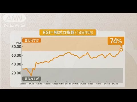 株価の過熱感を示すテクニカルな指標「RSI」=相対力指数は、「買われすぎ」の目安となる70%を上回り74%に上りました。