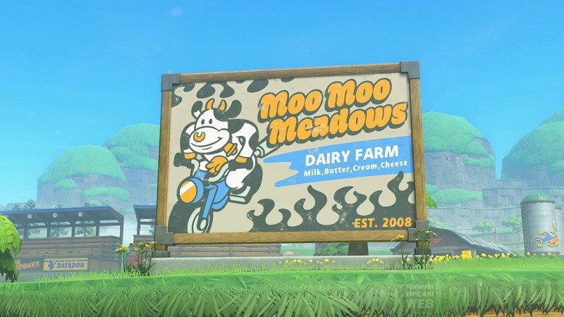 看板の右下にある「EST. 2008」(2008年設立)は、「モーモーカントリー」が初めて登場した『マリオカートWii』の発売年ですね。
