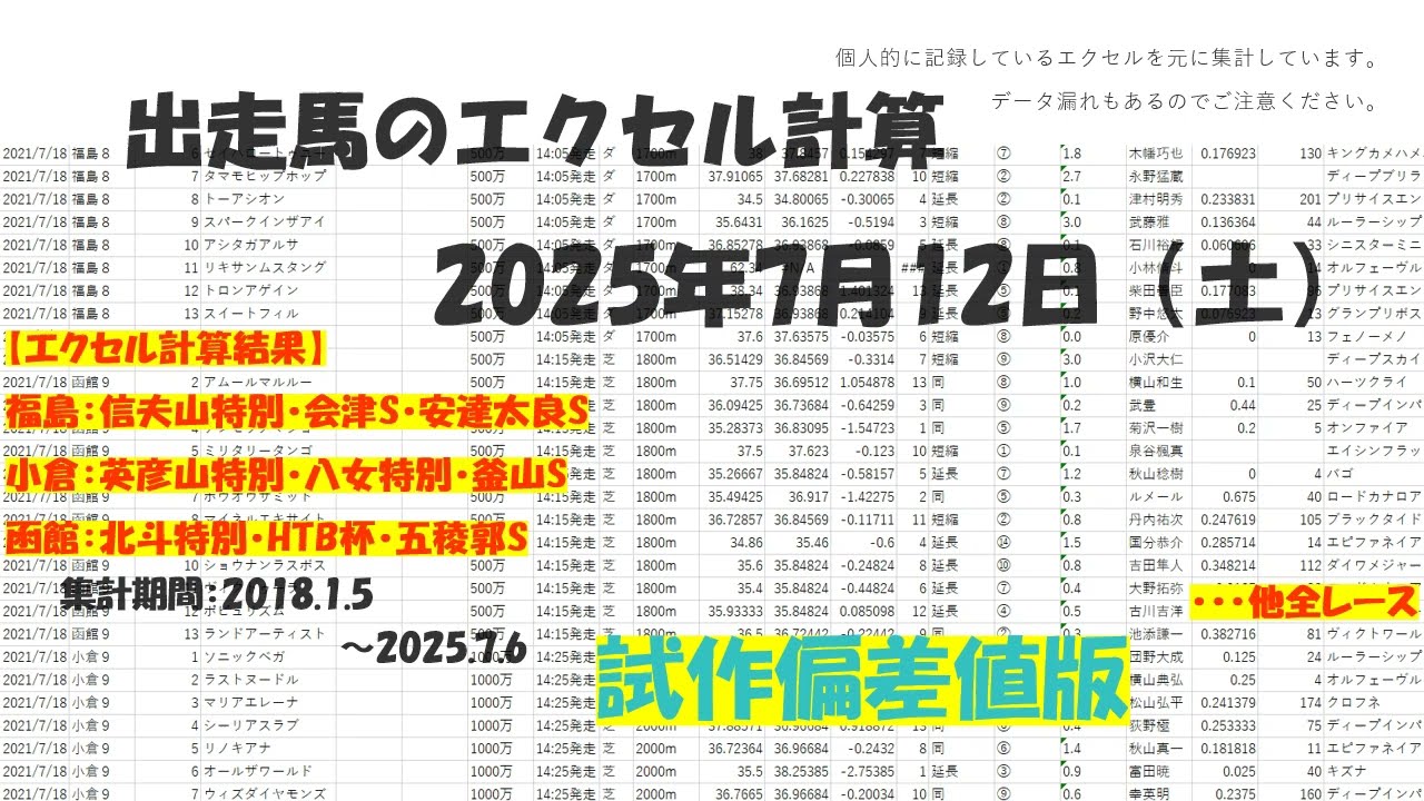 【競馬予想】過去3走分の偏差値をエクセルで計算してみた【2025年7月12日(土)】