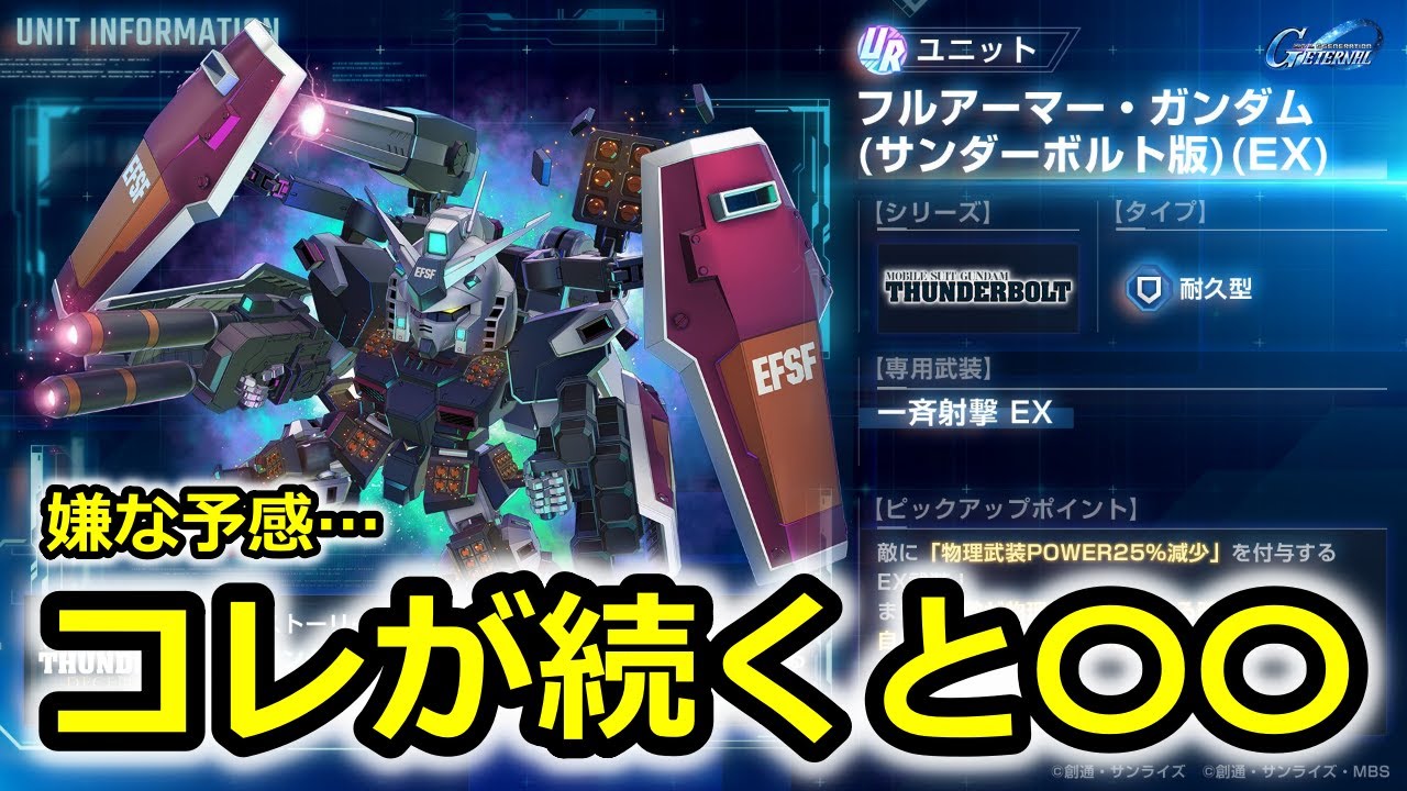お疲れ様です。ゼロ中です。今回の動画は 明日ガチャに追加される最古とフル アーマーガンダム、あとそのパイロットの 一部情報が公開されたのでそちらを見て いきたいと思います。で、まず最コザから なんですが、え、こちら支援型のモビル スーツとなっていて、え、ストーリー イベント、起動戦士、ガンダム、サンダー ボルト、ディセンバースカイにいては敵に 与えるダメージとボス挑戦チケットの獲得 量がアップと、ま、毎度お馴染みの ボーナスみたいな感じですかね。ただ別に 与えるダメージアップしなくても余裕で 倒せるし、ま、ボス挑戦チケットの獲得量 がアップとのことなんすけど、ま、この 期待じゃなくても多少はボーナスはつくと 思うんで、それをで、え、ハードステージ を周回するだけで、ま、そんなに報酬急が なければ、ま、余裕で取り切れると思い ます。毎日ハードステージをね、こなす だけで、ま、おそらく今回もそんな バランスだと思うんですよね。で、専用 武装が一斉射撃EXで、これが、え、敵に 特殊武装による非ダメージ25%上昇を 付与するEX武装とで、あと自身の起動力 が15%上昇するアビリティを所持という ことなんですけど、結構最近ね、いろんな 期体をSP化させたりして使ってると支援 機のデバフより先にSP化させた攻撃型の 攻撃が当たっちゃうことが多いんですよね 。だからSP化させた攻撃型の期待より 起動力が無突の状態で高いぐらい起動力が 高ければいいんすけど、ま、そうだったら ありがたいなっていう感じですね。え、 続いてそのパイロットのダリルローレンツ です。こちらも支援型のパイロットとなっ ていて、え、支援攻撃反撃の回数が最大2 回。また登場ユニットが最古小EXの時 自身のテンションが超一撃以上で物理 ビーム武装の最大射程が1上昇する アビリティを所持ということで、え、ま、 支援攻撃2回ってのは、ま、大体分かって たことなんすけど、ま、今開催中の廃入の アムロみたいな感じでしょうかね。ま、 専用の最古ザに乗ってる時に、ま、特に あれですね、ガチャさん限定になりますか ねの時にテンションが超一撃以上で、ま、 特定武装の射程が伸びると。ま、物理ビー ムって限定してるんで、ま、見たまんまの 物理、ビーム、武装の攻撃になるのかなと 思うんですが、デバフは特殊属性だったっ ぽいですよね。だからEX武装の属性って どうなるのかなと。ま、大体EX武装って 2種類の属性になんのかな。物理ビーム 属性でデバフは特殊ってことは多分ないと 思うんで、ま、そこがどうなるんすかね。 で、あと、ま、ハイニューガンダムの時も 思ったんすけど、これ系でアビリティを1 個潰すと、その乗せ替えの時がちょっとね 、そのモビルスーツも要は最大射程1 マイナスの状態で調整されるのかな?どう なるんすかね?これでサイコザがその デバフとかがね、射程5だったらいいすよ 。このアビリティで射程6になるとかだっ たら分かるんすけど、この最大射程が1 伸びるアビリティがあることによって射程 4であるともうダリル以外載せた時に結構 正直使いづらいんですよね。支援機が射程 4っていうのは。だからモビルスーツとし ても微妙になるし、パイロットは パイロットで他の機体に乗せた時に アビリティが1個死ぬんで、ま、それも 微妙になると、ま、どう考えても乗せ替え がつまらなくなっちゃうと思うんですよね 。こういうアビリティって。ま、それで ちょっとバランスを取ってるのかもしん ないですけど、最近の傾向としてはあまり 良くない気がするなと思いました。 やっぱりGジェネってこの乗せ替えが 楽しいというか、ま、今で言うと支援 アムロをニューガンダムに乗せると めっちゃ強いじゃないですか。ま、こう いうパイロットが増えてくるとそういった 楽しみができなくなってしまうのかなって いうのは思いましたね。続いてフルー アーマーガンダムサンダーボルト版を見て いくんですけども、こちらは耐久型の期待 となっております。こちらもストーリー イベントで与えるダメージとボス挑戦 チケットの獲得量がアップすると。で、 専用武装、え、こちらも一斉射撃EX。 ただ効果が、え、敵に物理武装パワー 25%減少を付与するEX武装とでさらに 、え、敵が物理武装で攻撃する時に自身の 非ダメージが30%減少する、ま、軽減 するアビリティかを所持しているという ことで、ま、物理パワーが、え、25% 減少するEX武装なんで攻撃力デバフも あるのかな?一応あったとしてももう物理 の方が最大強化で35%になるんで、攻撃 力があったとしても25%デバフになるの かな。ま、現状ね、攻撃力デバフだけで 足りてるんで、この武装の属性によって 武装パワーを下げるデバフっていうのが どうなんですかね。ま、一応明日からあの エターナルロードも新しく追加されると いうとことなんで、ま、そういうところで 使い道がないとちょっと使いづらいのか なっていう感じはしますね。ま、来月 始まる新イベント