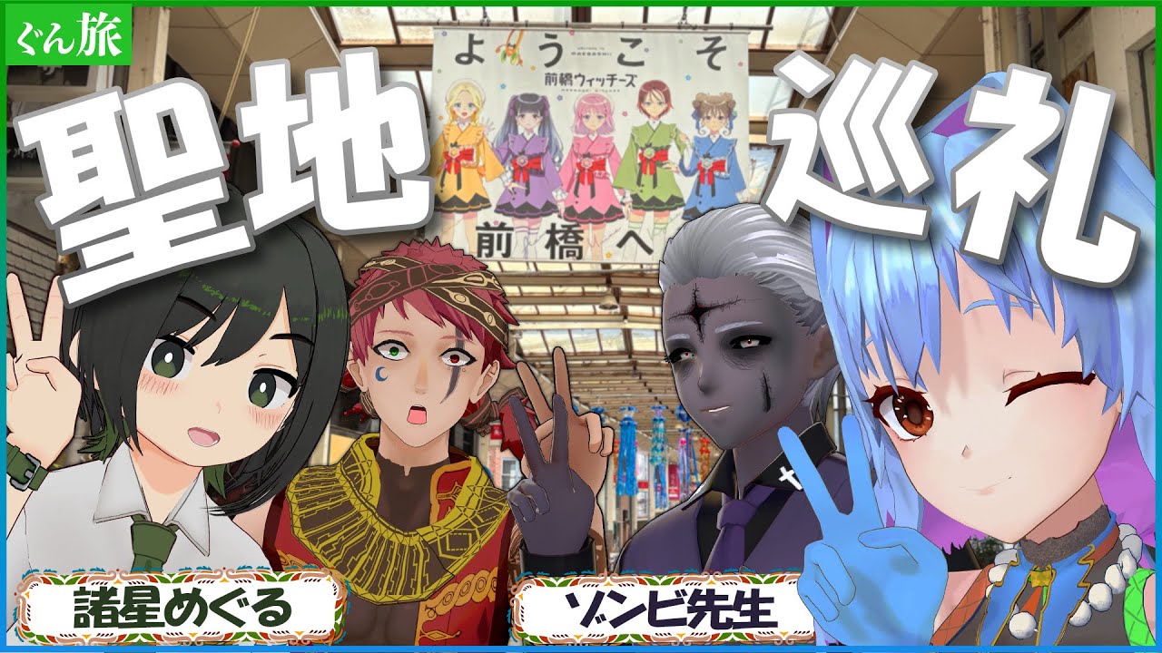 レディジェントルメン、 Pキハイカーズのルピナです。 おはようございます。ピキハイの名ロです。そ、そ はい、皆さんにちは。ゾミ先生です。 そして メくるめくるメそぶ初店の諸星めぐるです。 ようこそ、ようこそ。 いや、ました。前橋駅 前です。 前橋といえば何ですか? ウア橋ウッチ。 [音楽] イエー。 大人4 人集まってい人いないじゃん。あかんて。あかんて。だから 踊ると人いないから、ま、大丈夫なんですけども。そうなんですよ。今回あの前橋ウッチーズ まめぐちゃんがねまずドはまりをしている。 その後、え、みんな見ました。 はい。 え、りました。 どはまりました。イエイ。 そしてね、なんと聖地巡礼の第 1議ゾンビ先生まで連れて 正地巡礼をしちゃおうじゃないかという。はい。 ああ、いいですね。私ももう 2日で見ましたから全然。 はい。 行きだ。 こん中で1 番オタクかもしれない。そういう。 え、のちょっと推塩を教えてください。あずちゃんです。 あずちゃん。 ああ、もう私はさんですね。 さん。はい。 僕と同じで真面目なんで。 お、 僕はね、ちょこちゃんだね。 はい。 ちょこちゃん。 あ、ちょこちゃん。ああ。え、私ゆいナッチリンですね。 あ、いいですね。ポジティブ最高。 推しが別れてね。 そう。1人1人 あれ5 人ないからね。しょうがない。しない。しゃあな。そう。そこは誰かとかそういうのは回さなんでね。そう。 もうあのそれぞれの色のT シャツ買いましたからね。ま、そして前橋駅でこちらの前橋ウィッチーズ舞台巡りブックが配布されてたので。 すごいよね、これ ね。 めちゃくちゃクオリティ高いですよ、これ。 この場所だよのがマップで描かれていて すぐに置巡礼ができるというね。 はい。 素晴らしい。 いや、ありがたいので今日はこれを見ながらいろんなところ巡ってみようと思います。 よろしくお願いします。 よろしくお願いします。 いや、これがね、 強科さんの実家ですよ。 そしてみたいな後ろにある 実家ですみ。 なんかいきなり実家に凸するっていう厄介オタク。厄介。厄介オタク。 やばい。もぐたんだ。だけるんだもんね。 もうお店に行けるんでしょ、これ。 ここあれですね、あのちょこちゃんとかさんがビラを配ってた場所ですね。 ああ、そうだね。そうだね。 アクセル前橋っていうね。 ちょっと前まで何にもないただのガ道だったビル はい。ゴーストタウンみたいになってたし、なんだったらここに入ってたコンビニすら潰れましたけども。 すごい。 数年前に完全リフォームで新しくなっていっぱい入ったね。 メインのローズアベニュー。 え、しかも今ちょうどマジでやってるとこだ。 そう。あの、今週末が田夕祭りなんで。 ええよき。 あ、これ千田町局ちょいちょい映像に入っていた。 はいはいはいはいはい。 え、すご。 第1 話のお洋服が高くて買えなかったようが多分ここを通ってる時に あしてる。 あ、ここなの?ここ。 多分ここなのよ。多分この眺め第 1話で必ず見るおしゃれもお洋服屋さんと なんかチョコレートって 書いてある お店と でですね はい 第1 話じゃないんですけどすごい神会の話になっちゃうんですけどいきなり 今玉摩端祭りで屋根がついてるんですけど普段は屋根ないんですよ。 ということでここがあの第 10話で みんなが泣いたあのシーン ああ あそう あのシーの場所です ご飯食べた場所に戻ろうの なるほど ここなんだ こご飯を食べてました う鳥肌やば であそこの交差点 うんこでていたとこの そう はあそれもあれですよねここが最初やって最後ここってこうそうそうそうそう来なきゃわかんないわ うんこの真ん中で、多分ね、そう なので、そう、あの、たんでしょうね。あ、 で、じゃあ戻った場所、ここのご飯食べる場所に戻ろうがここになるっていう。 おしゃれ。 なくてね。 いや、なくて。 シャッター街の、 シャッター街の中心でなくな。 いや、なくて1 話と10 話はほぼ同じ場所なんです。そう。 え、それもえ、もう閉じてるじゃないですか。 そうなんです。カバ屋さんで向こう側がお茶屋さん。 あとね、これ私のおすすめ。 これいいね。 それね、眉って言っても商店街の人が書いたからめちゃくちゃ味わい深いんですよ。 鬼わ外豆を巻いてる家の鬼。 あ、お父さんがね。お父さんが ああ、いいですね。お手伝い。逆に仕事が増えとるわ。 あ、これはそうですね。そうやけど、まあでもいいよね。家族のだよね。 うん。俺のよりちょっとお高い猫の餌。 龍なって。 そう、 これ、 これ眉千龍です。 あ、いるね。 あ、 前橋ウッチ吹き流し あるじゃん。 ケロッぺ5、5人いるね。 いるね。 すねかい。 おばさんのファッション屋さん。 え、なんか本屋さんめっちゃ。 そう。おばさんのファッションって名前だからね。悪口言ったんじゃなくて。おばさんのファッションって書いてある。あんなに。 読み上げただけです。 そう、そう。 読み上げただけです。 すげえ怒ろうかなと思っちゃった。