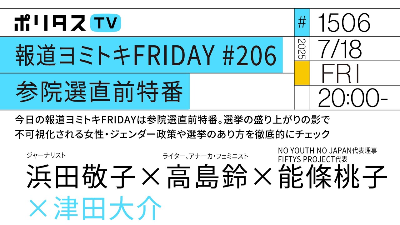 報道ヨミトキFRIDAY #206 参院選直前特番|今日の報道ヨミトキFRIDAYは参院選直前特番。選挙の盛り上がりの影で不可視化される女性・ジェンダー政策や選挙のあり方を徹底的にチェック(7/18)
