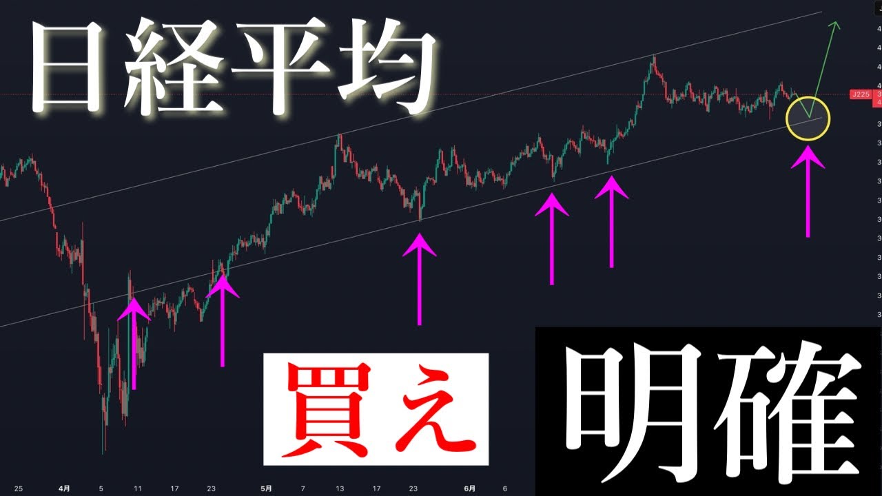 はい、ということで日経平均変え明確です 。ということで日経平均の分析していき ます。今回は週明けで昨日の動画と似た ような動画になってしまうのですが、 シンプルに日経平均は8月上昇していく 可能性が高いかなという風に思いますので 、今回それについての理由について解説し ていこうかなと思います。え、この動画 日経平均をローソので分析するという 面白いチャンネルになってますので気に なる方は最後まで、え、この動画見ていっ てください。で、なぜ日経平均は8月 上がるのかって言ったのかっていうと、 それは昨日の動画です。昨日動画で日経 平均は2年半のサイクルで上がりますよと いう風な動画をあげていきました。ま、 分かりやすく言うと、え、これですね、 週足ですね。見た時のこういうね、え、 こう2年半のこうサイクルで上がりますよ みたいな、え、いう風な分析ですね、上げ ていって、今回もここですよみたいな、え 、分析ですね。それがちょうど、ま、8月 になるよみたいな分析上げさせていただい てるんですが、気になる方は是非前回の 動画ね、見ていただければなという風に 思うんですが、え、それから理由になり ます。大ね。で、その上で、え、もちろん 長期だけではね、判断できないですので、 短期も見ていくわけなんですが、短期に 関しても今、え、売る、変える理由しか ないっていうの相場になりますので、結構 目線としては強いかなと思います。で、 そこについて今回は解説していくんです けど、ま、短期の分析だったり解説って いうのは全て概要欄のDisccordで あるコミュニティ、こちらを使って発信の 方をしています。え、こちら村上トレード サロンのサロンで、さっき解説したような 内容を、え、リアルタイムでこのような形 で株の分析ね、上げさせていただいて、ま 、それを中心にドル円ゴールドビット コインと様々な分析を上げさせてもらって います。え、このような感じで今日はね、 ゴールドのロングしっかりとみんなが取れ ましたっていう風な報告いただいており、 これね、え、全てリアルタイム投稿になり ますので、気になる方はチェックしてみて ください。え、さらにそれに参加するため 必要のバンテージ、こちら登録するだけで 1万5000円もらいます。え、この バンテージの会社まず登録だけで 1万5000円もらいますので、もし登録 したことがないという風な方是非やってみ てください。で、それだけではなくてこの 会社、え、日経平均の方めちゃくちゃお すすめで少ない資金しかないでも、え、 国内の株だったり、ま、米国株やりたいっ ていう風な人、日本株だったりね、え、て いう風な人いると思うんですけど、正直 できないです。え、日本数百万は必要に なってきます。ただこの証券会社だと レバレチをかけることができるので、え、 数万円から、え、資金を増やすことが可能 です。え、是非ですね、えっと、少ない 資金からでも取れ、あの、触ってみたいと 先物でもないので、触ってみたいという風 な人は是非チェックしてみてください。と いうことで今回の分析やっていきます。 まずは、え、4時間足週足は先ほど言った 通り、ま、そういう理由から、ま、8月 上昇していくんじゃないかって理由なん ですけど、4時間足がね、めちゃくちゃ 強いんですよ。で、どこが強いのかって いうと、まず移動平均線、この4時間足 ピンクのこの移動平均線ですね。この 200EMAっていうのがめちゃくちゃ まず反発しているっていうようなところと 、2つ目はこの斜めのトレンドラインです ね。ここをね、しっかりと線引いていくと 、ま、めちゃくちゃ合ってるんですよ。で 、この2つの根拠っていうのがあるので、 日経平均をここまで例えば下がっていき ましょう。例えば3万9400とか、ま、 500割ってきてみたいな400、500 、400、300ぐらいまで来たら めちゃくちゃチャンスだと思います。なの で日経平均は今週もし下がってきたとし たら非常に重要な買になりますので、是非 買ってみてください。で、あとシンプルに もうここの高値抜けたら、ま、とりあえず 高値近辺まで行くと思いますので、え、 ロングしていったらいいんじゃないかなと 思います。なのでここで拾うかここで拾う か買うかっていうイメージですね。え、 それでもシンプルに立ちまっていったら いいんじゃないかなと思います。例えば1 時間足とかもこうやってね、動きがかなり 乱立してて、え、どっちの方向にかけたら いいだろうみたいな、え、考えてる人も 多いと思うんですけど、もう考えなくて いいです。ここで買うか、ここで買うか です。今回シンプルですよ。もう今回、 もうこの動画ここで終わりますからね。 もうべちゃべちゃもう喋らないです。 めちゃくちゃあのさ、5分も6分も10分 も、え、喋りません。ここで拾うか、ここ で拾うか。もうこの2択です。なので今は 会場ですか?違います。買わなくて結構 です。ひたすらここに来るまで待って 